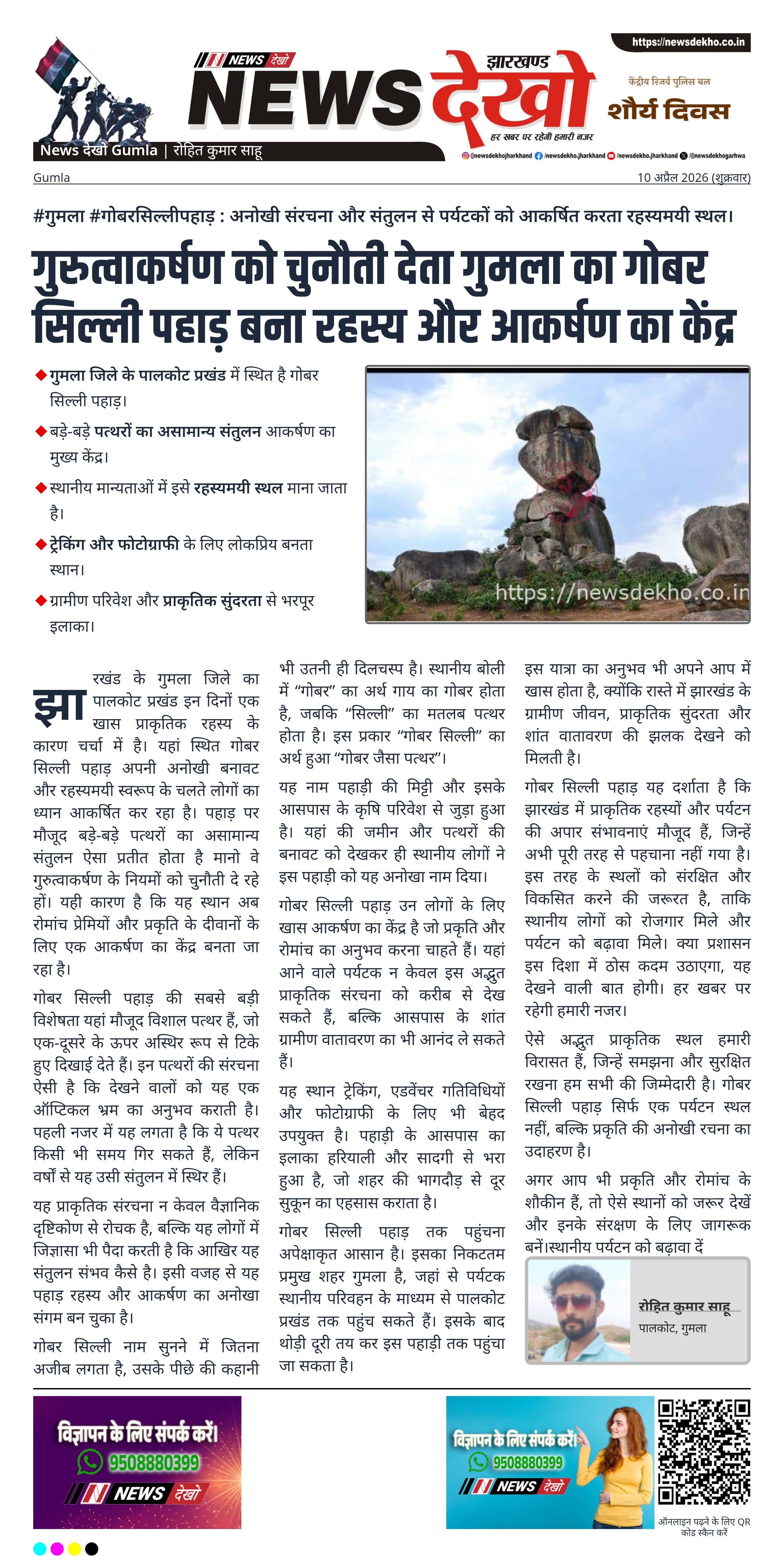 झारखंड के गुमला जिले का पालकोट प्रखंड इन दिनों एक खास प्राकृतिक रहस्य के कारण चर्चा में है। यहां स्थित गोबर सिल्ली पहाड़ अपनी अनोखी बनावट और रहस्यमयी स्वरूप के चलते लोगों का ध्यान आकर्षित कर रहा है। पहाड़ पर मौजूद बड़े-बड़े पत्थरों का असामान्य संतुलन ऐसा प्रतीत होता है मानो वे गुरुत्वाकर्षण के नियमों को चुनौती दे रहे हों। यही कारण है कि यह स्थान अब रोमांच प्रेमियों और प्रकृति के दीवानों के लिए एक आकर्षण का केंद्र बनता जा रहा है।