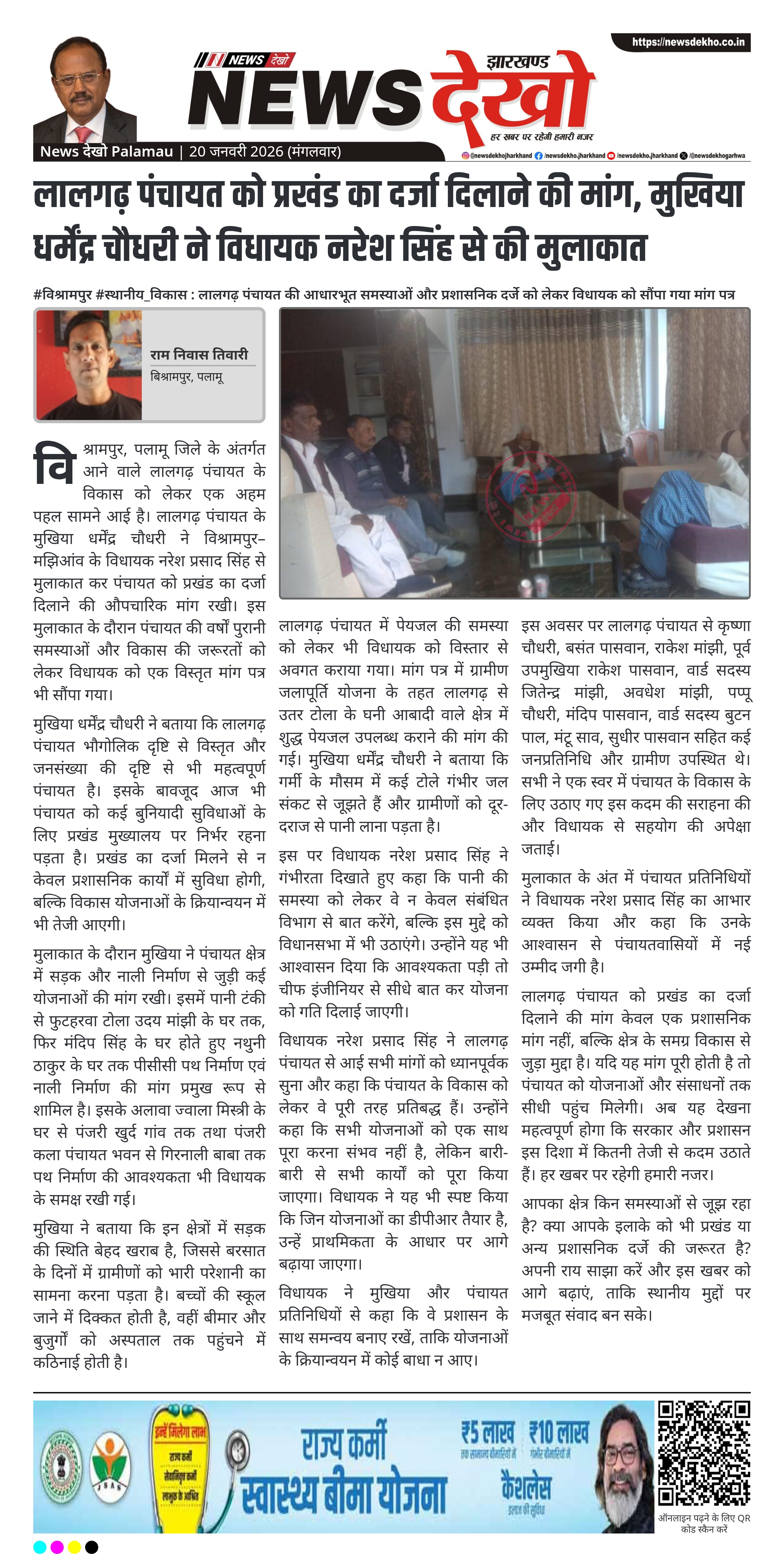 विश्रामपुर, पलामू जिले के अंतर्गत आने वाले लालगढ़ पंचायत के विकास को लेकर एक अहम पहल सामने आई है। लालगढ़ पंचायत के मुखिया धर्मेंद्र चौधरी ने विश्रामपुर–मझिआंव के विधायक नरेश प्रसाद सिंह से मुलाकात कर पंचायत को प्रखंड का दर्जा दिलाने की औपचारिक मांग रखी। इस मुलाकात के दौरान पंचायत की वर्षों पुरानी समस्याओं और विकास की जरूरतों को लेकर विधायक को एक विस्तृत मांग पत्र भी सौंपा गया।