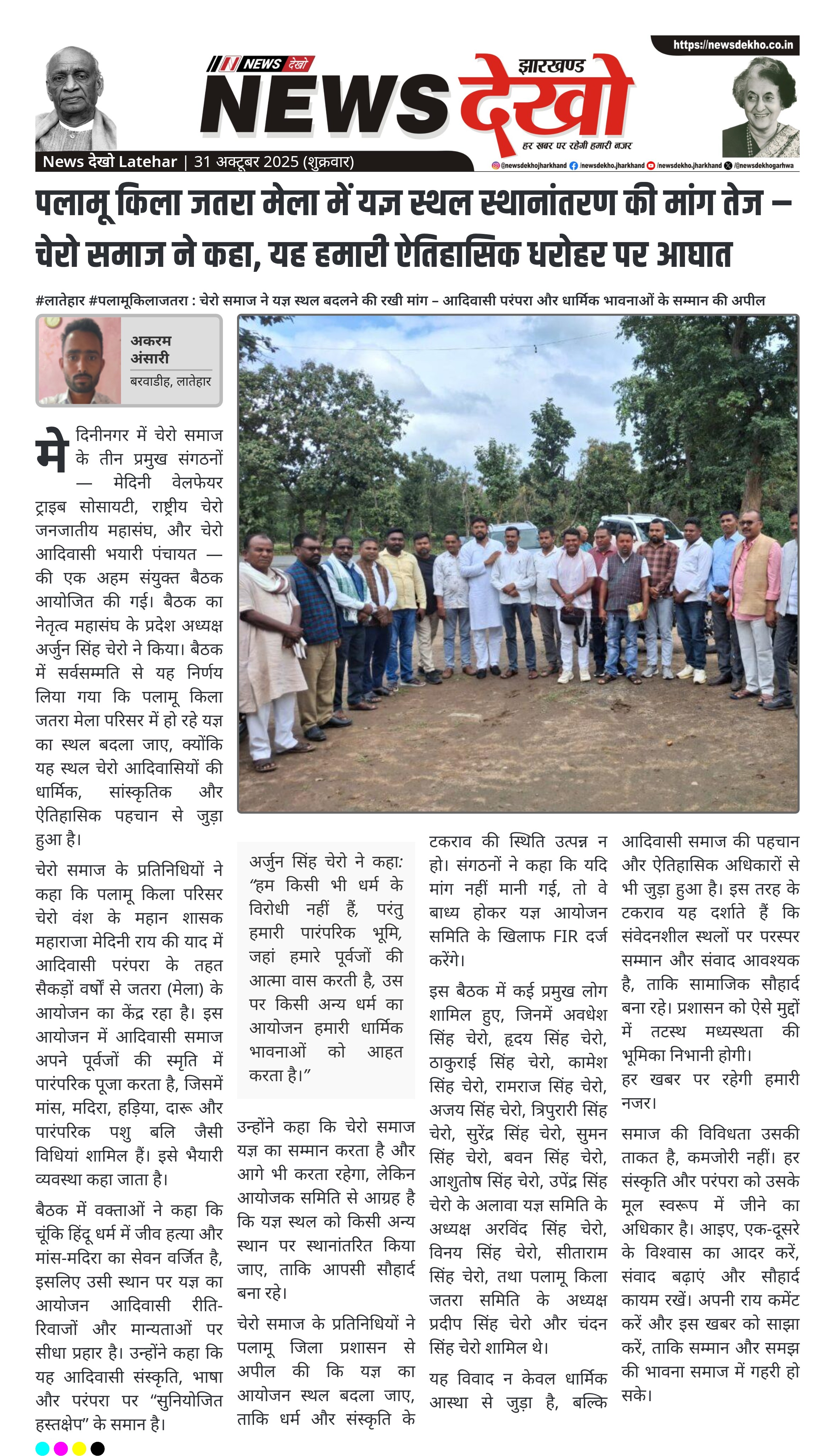 • पलामू किला जतरा मेला परिसर में आयोजित यज्ञ स्थल को स्थानांतरित करने की मांग को लेकर चेरो समाज ने जोर दिया।