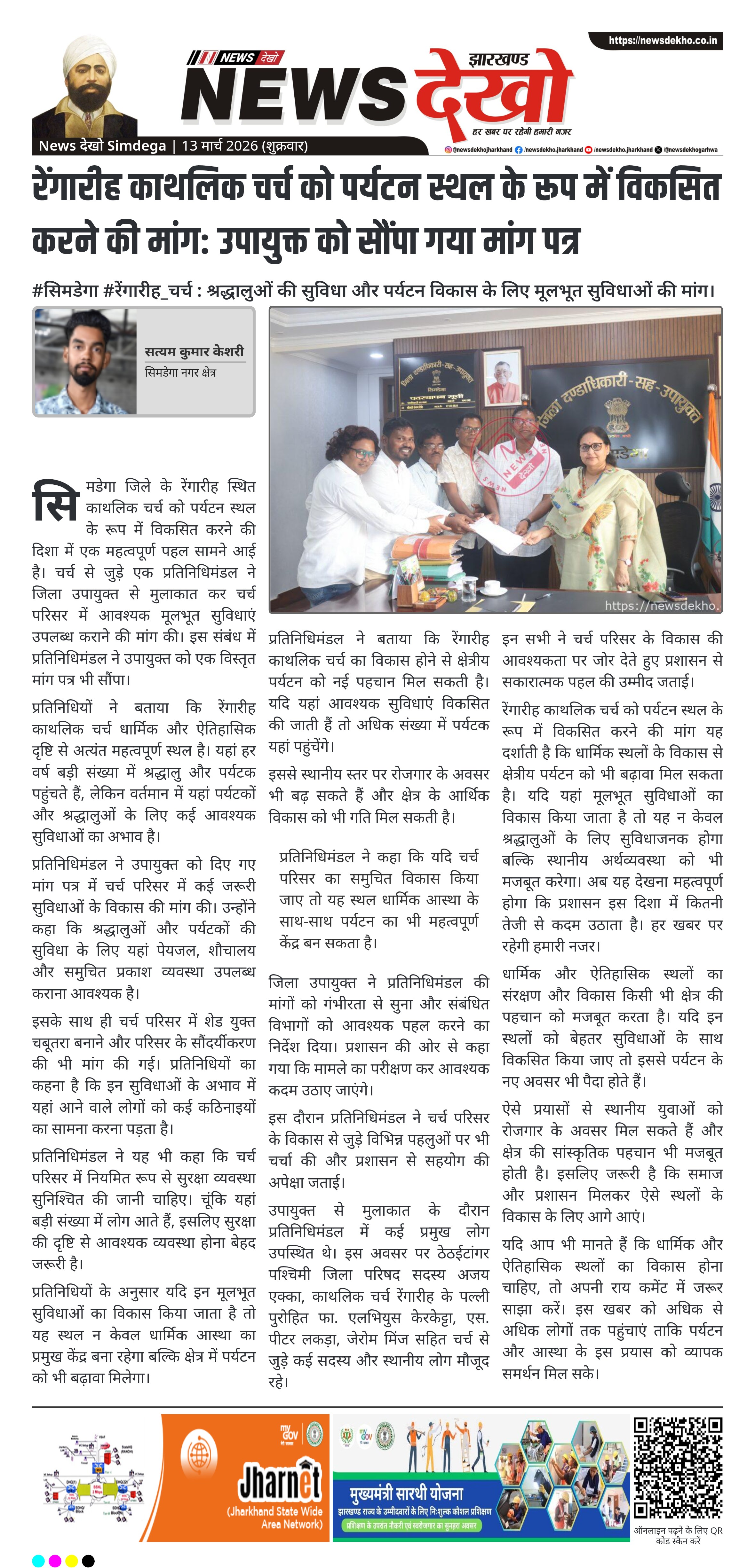 सिमडेगा जिले के रेंगारीह स्थित काथलिक चर्च को पर्यटन स्थल के रूप में विकसित करने की दिशा में एक महत्वपूर्ण पहल सामने आई है। चर्च से जुड़े एक प्रतिनिधिमंडल ने जिला उपायुक्त से मुलाकात कर चर्च परिसर में आवश्यक मूलभूत सुविधाएं उपलब्ध कराने की मांग की। इस संबंध में प्रतिनिधिमंडल ने उपायुक्त को एक विस्तृत मांग पत्र भी सौंपा।