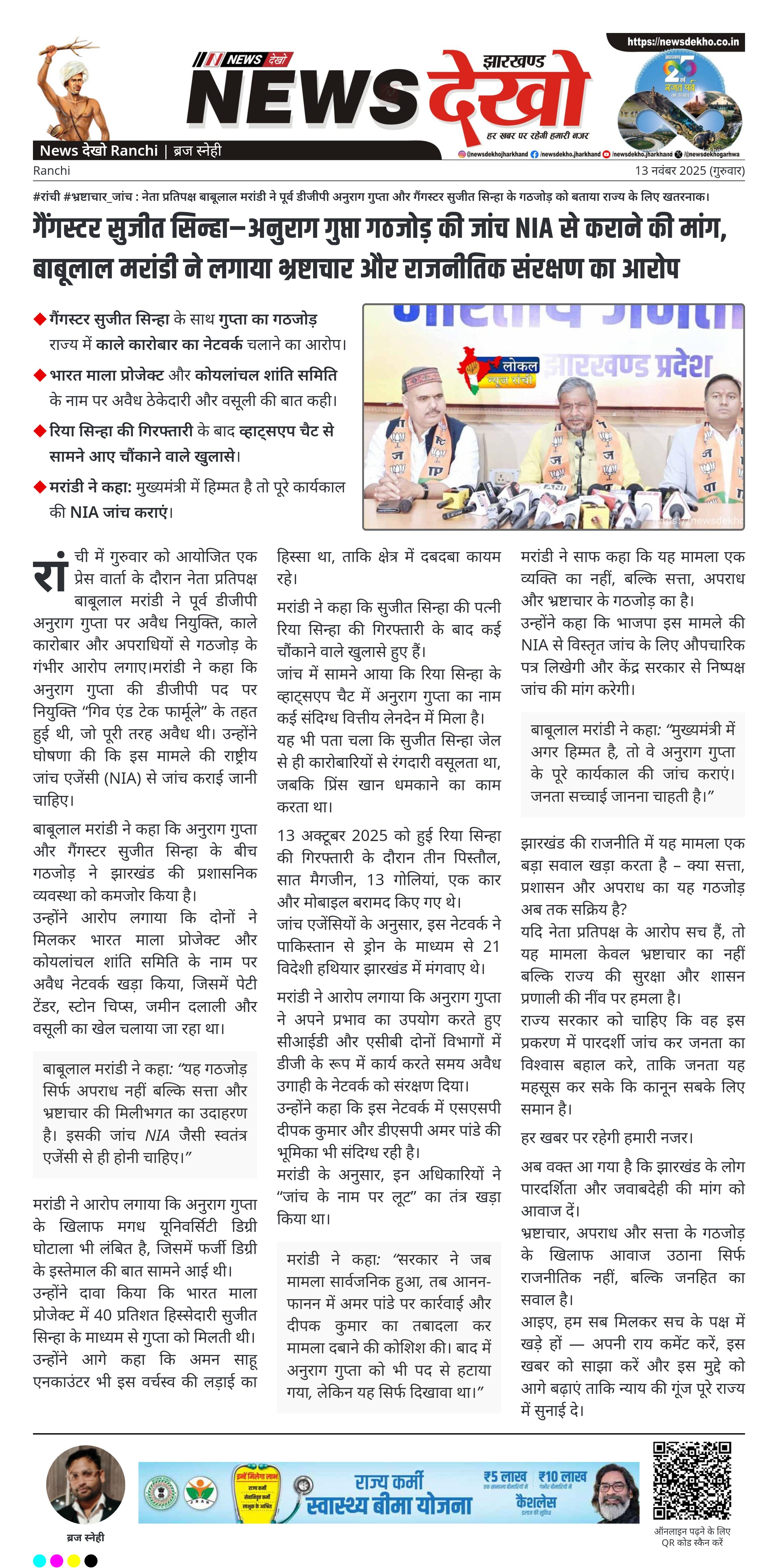 #रांची #भ्रष्टाचार_जांच : नेता प्रतिपक्ष बाबूलाल मरांडी ने पूर्व डीजीपी अनुराग गुप्ता और गैंगस्टर सुजीत सिन्हा के गठजोड़ को बताया राज्य के लिए खतरनाक।