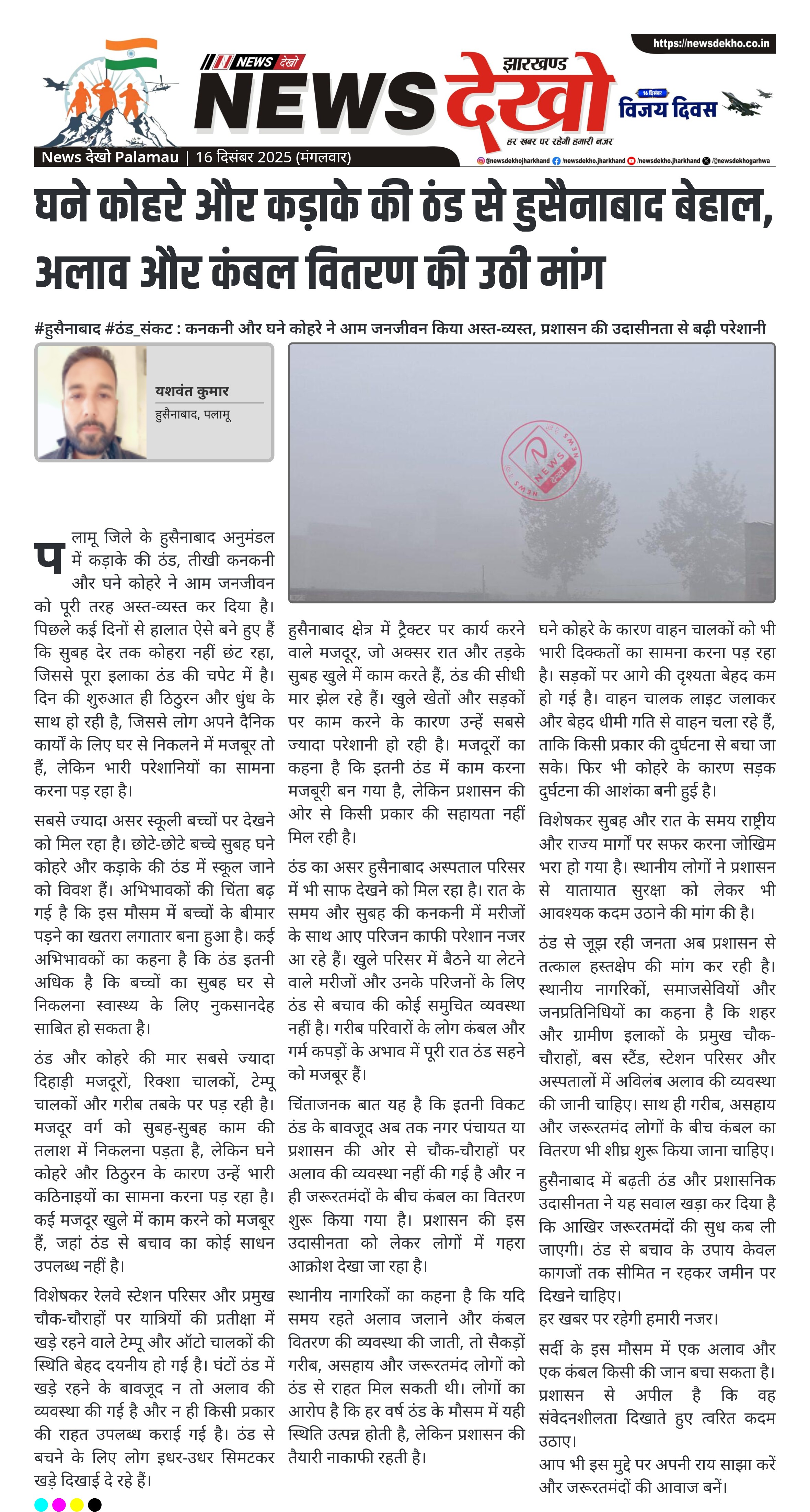 पलामू जिले के हुसैनाबाद अनुमंडल में कड़ाके की ठंड, तीखी कनकनी और घने कोहरे ने आम जनजीवन को पूरी तरह अस्त-व्यस्त कर दिया है। पिछले कई दिनों से हालात ऐसे बने हुए हैं कि सुबह देर तक कोहरा नहीं छंट रहा, जिससे पूरा इलाका ठंड की चपेट में है। दिन की शुरुआत ही ठिठुरन और धुंध के साथ हो रही है, जिससे लोग अपने दैनिक कार्यों के लिए घर से निकलने में मजबूर तो हैं, लेकिन भारी परेशानियों का सामना करना पड़ रहा है।