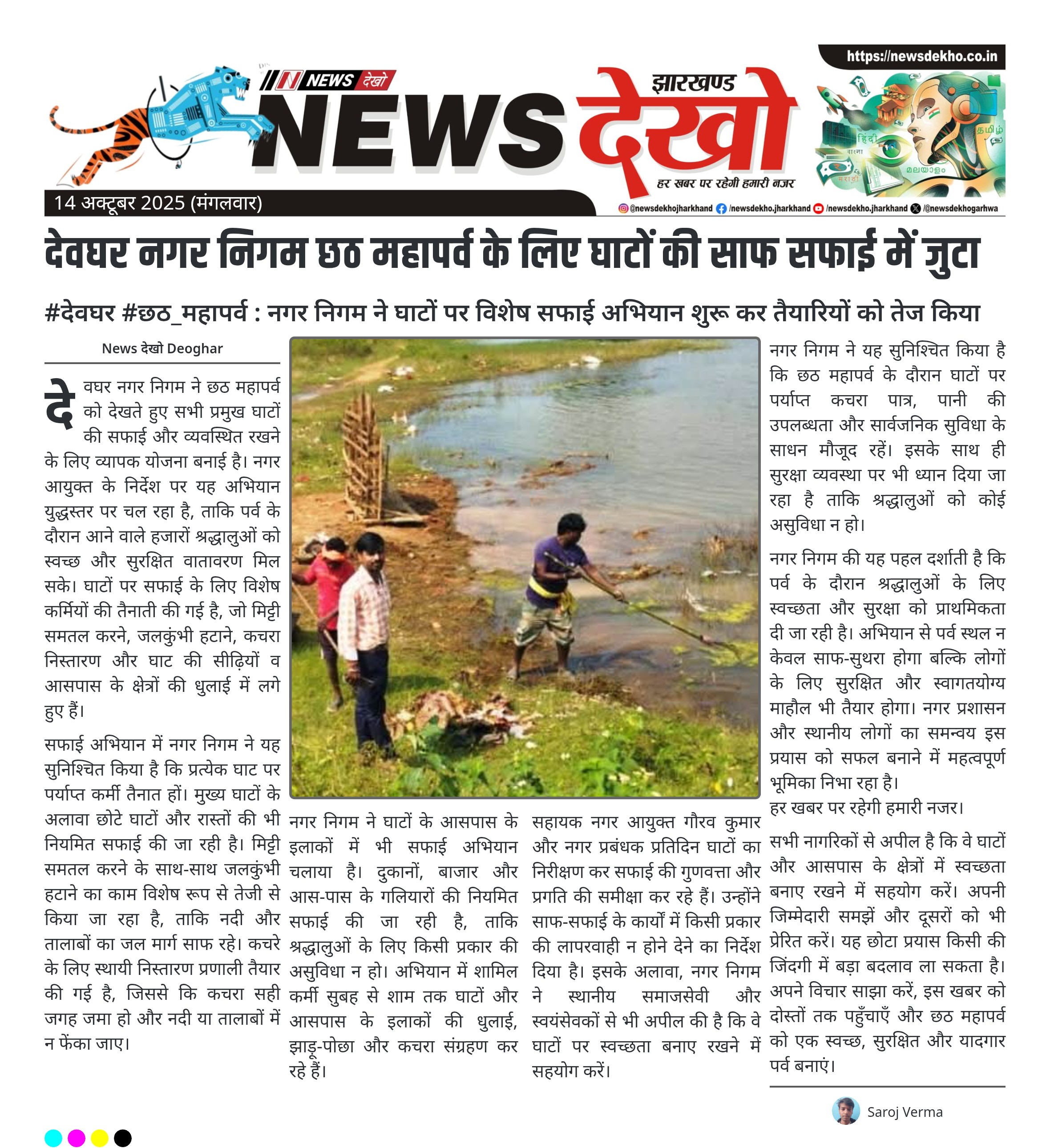 - देवघर नगर निगम ने महापर्व छठ को देखते हुए सभी घाटों पर विशेष सफाई अभियान शुरू किया।