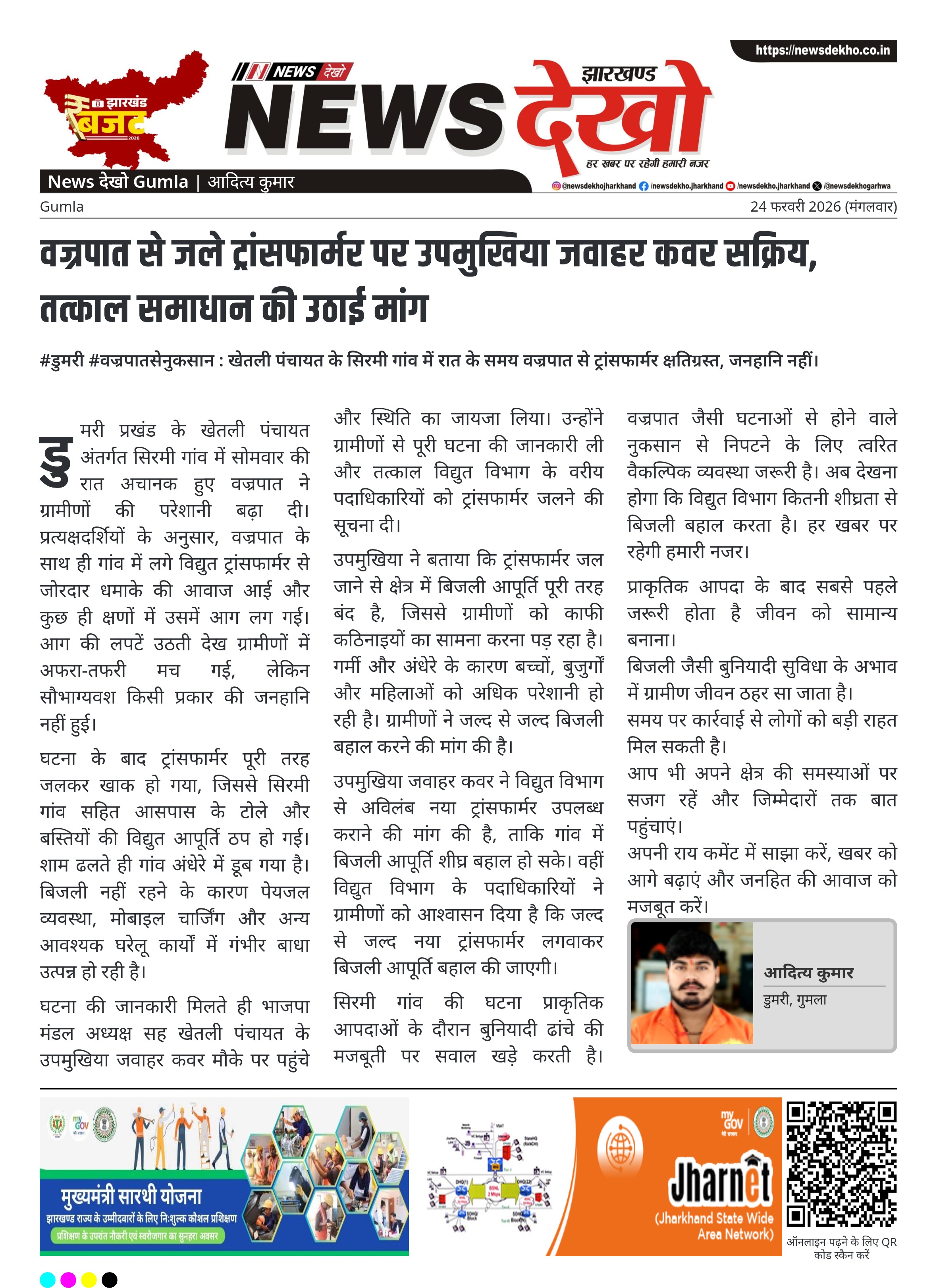 डुमरी प्रखंड के खेतली पंचायत अंतर्गत सिरमी गांव में सोमवार की रात अचानक हुए वज्रपात ने ग्रामीणों की परेशानी बढ़ा दी। प्रत्यक्षदर्शियों के अनुसार, वज्रपात के साथ ही गांव में लगे विद्युत ट्रांसफार्मर से जोरदार धमाके की आवाज आई और कुछ ही क्षणों में उसमें आग लग गई। आग की लपटें उठती देख ग्रामीणों में अफरा-तफरी मच गई, लेकिन सौभाग्यवश किसी प्रकार की जनहानि नहीं हुई।