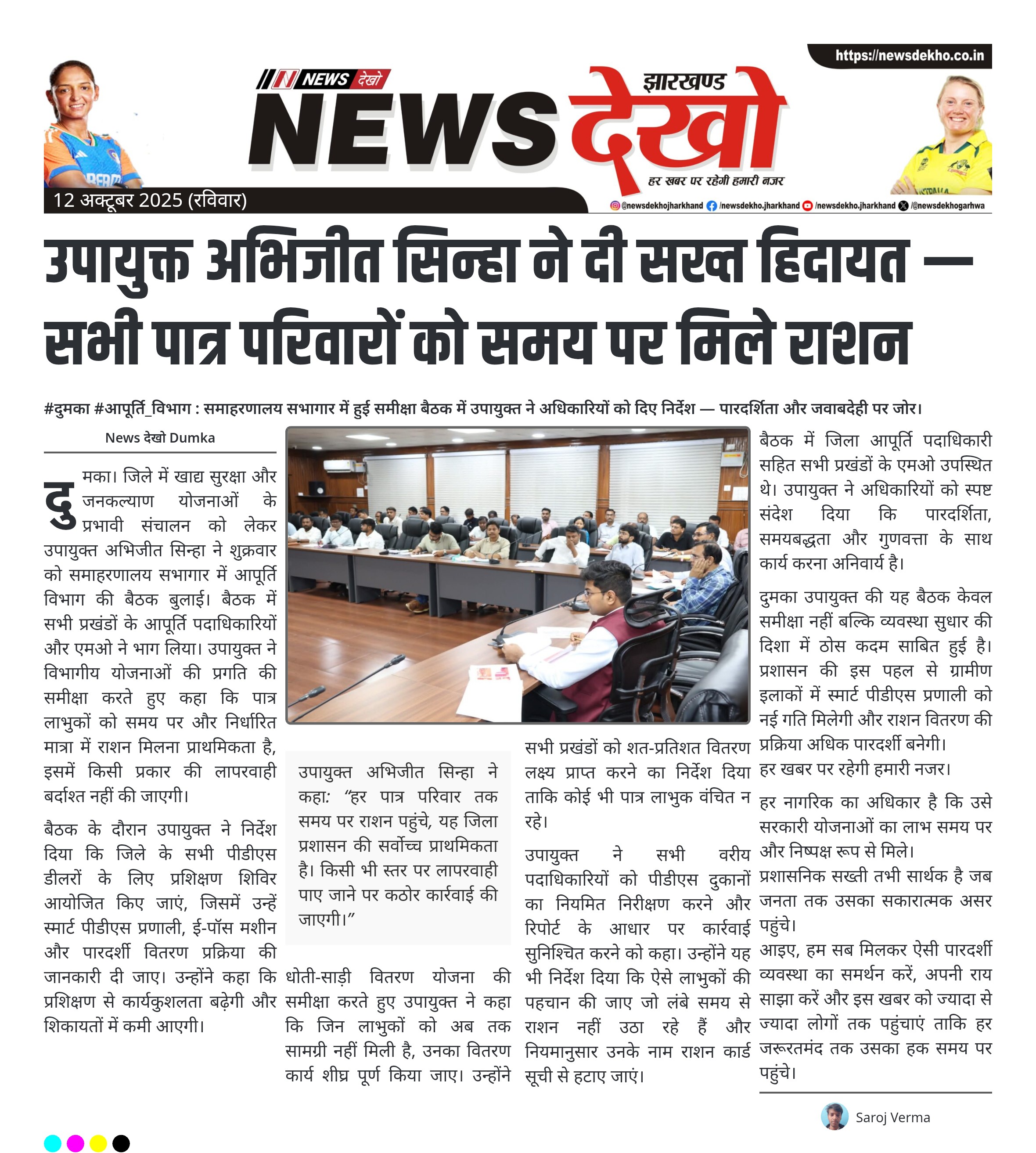 दुमका। जिले में खाद्य सुरक्षा और जनकल्याण योजनाओं के प्रभावी संचालन को लेकर उपायुक्त अभिजीत सिन्हा ने शुक्रवार को समाहरणालय सभागार में आपूर्ति विभाग की बैठक बुलाई। बैठक में सभी प्रखंडों के आपूर्ति पदाधिकारियों और एमओ ने भाग लिया। उपायुक्त ने विभागीय योजनाओं की प्रगति की समीक्षा करते हुए कहा कि पात्र लाभुकों को समय पर और निर्धारित मात्रा में राशन मिलना प्राथमिकता है, इसमें किसी प्रकार की लापरवाही बर्दाश्त नहीं की जाएगी।