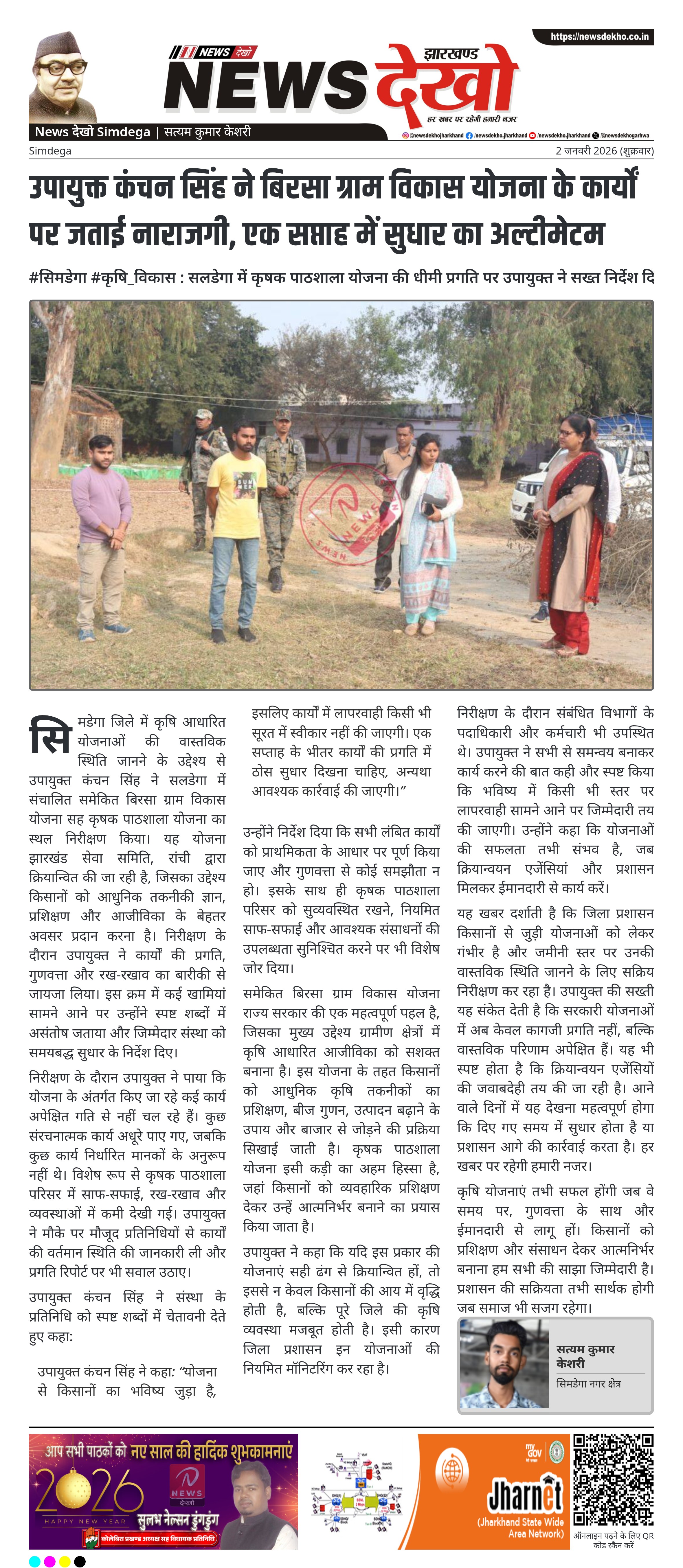 सिमडेगा जिले में कृषि आधारित योजनाओं की वास्तविक स्थिति जानने के उद्देश्य से उपायुक्त कंचन सिंह ने सलडेगा में संचालित समेकित बिरसा ग्राम विकास योजना सह कृषक पाठशाला योजना का स्थल निरीक्षण किया। यह योजना झारखंड सेवा समिति, रांची द्वारा क्रियान्वित की जा रही है, जिसका उद्देश्य किसानों को आधुनिक तकनीकी ज्ञान, प्रशिक्षण और आजीविका के बेहतर अवसर प्रदान करना है। निरीक्षण के दौरान उपायुक्त ने कार्यों की प्रगति, गुणवत्ता और रख-रखाव का बारीकी से जायजा लिया। इस क्रम में कई खामियां सामने आने पर उन्होंने स्पष्ट शब्दों में असंतोष जताया और जिम्मेदार संस्था को समयबद्ध सुधार के निर्देश दिए।