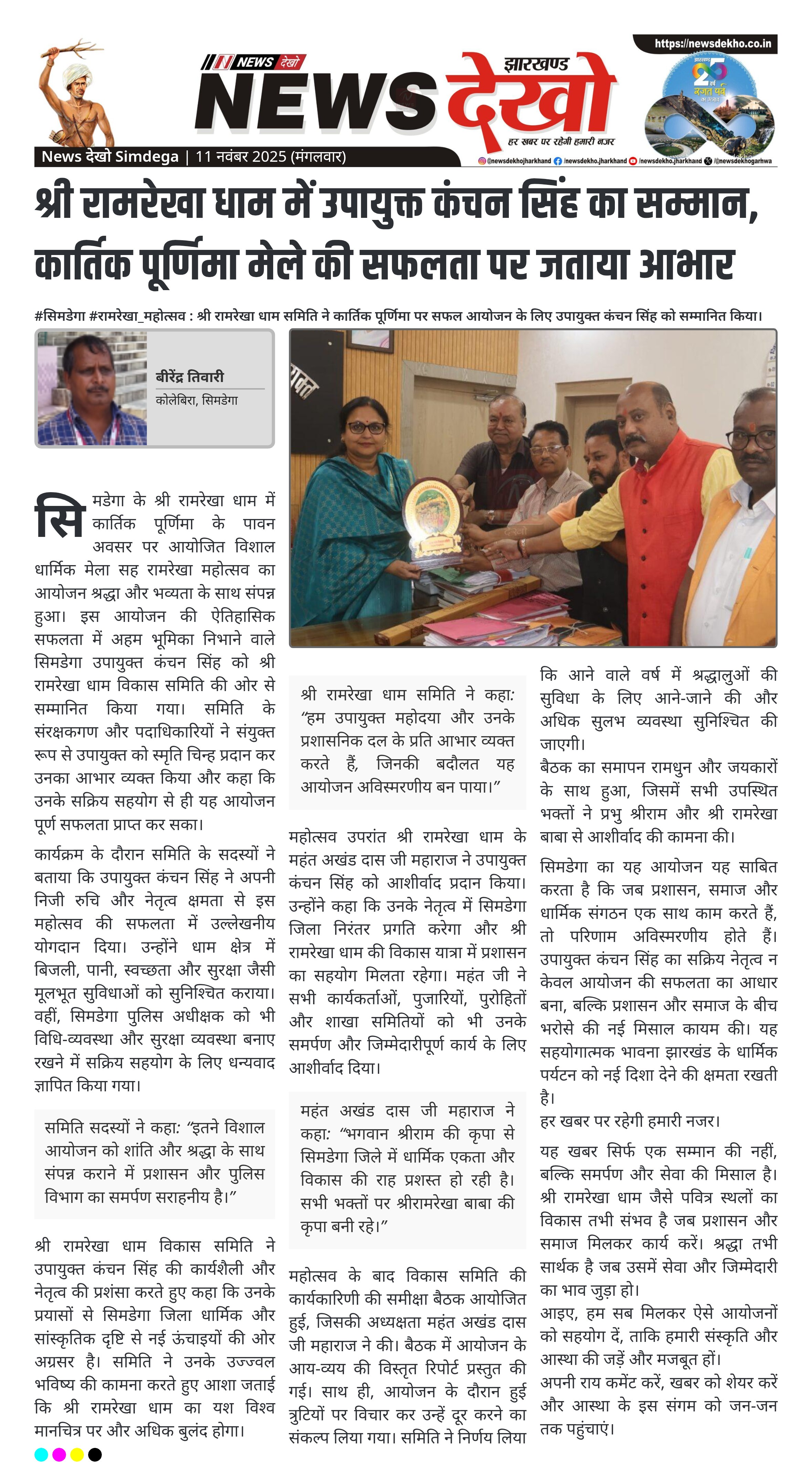सिमडेगा के श्री रामरेखा धाम में कार्तिक पूर्णिमा के पावन अवसर पर आयोजित विशाल धार्मिक मेला सह रामरेखा महोत्सव का आयोजन श्रद्धा और भव्यता के साथ संपन्न हुआ। इस आयोजन की ऐतिहासिक सफलता में अहम भूमिका निभाने वाले सिमडेगा उपायुक्त कंचन सिंह को श्री रामरेखा धाम विकास समिति की ओर से सम्मानित किया गया। समिति के संरक्षकगण और पदाधिकारियों ने संयुक्त रूप से उपायुक्त को स्मृति चिन्ह प्रदान कर उनका आभार व्यक्त किया और कहा कि उनके सक्रिय सहयोग से ही यह आयोजन पूर्ण सफलता प्राप्त कर सका।
