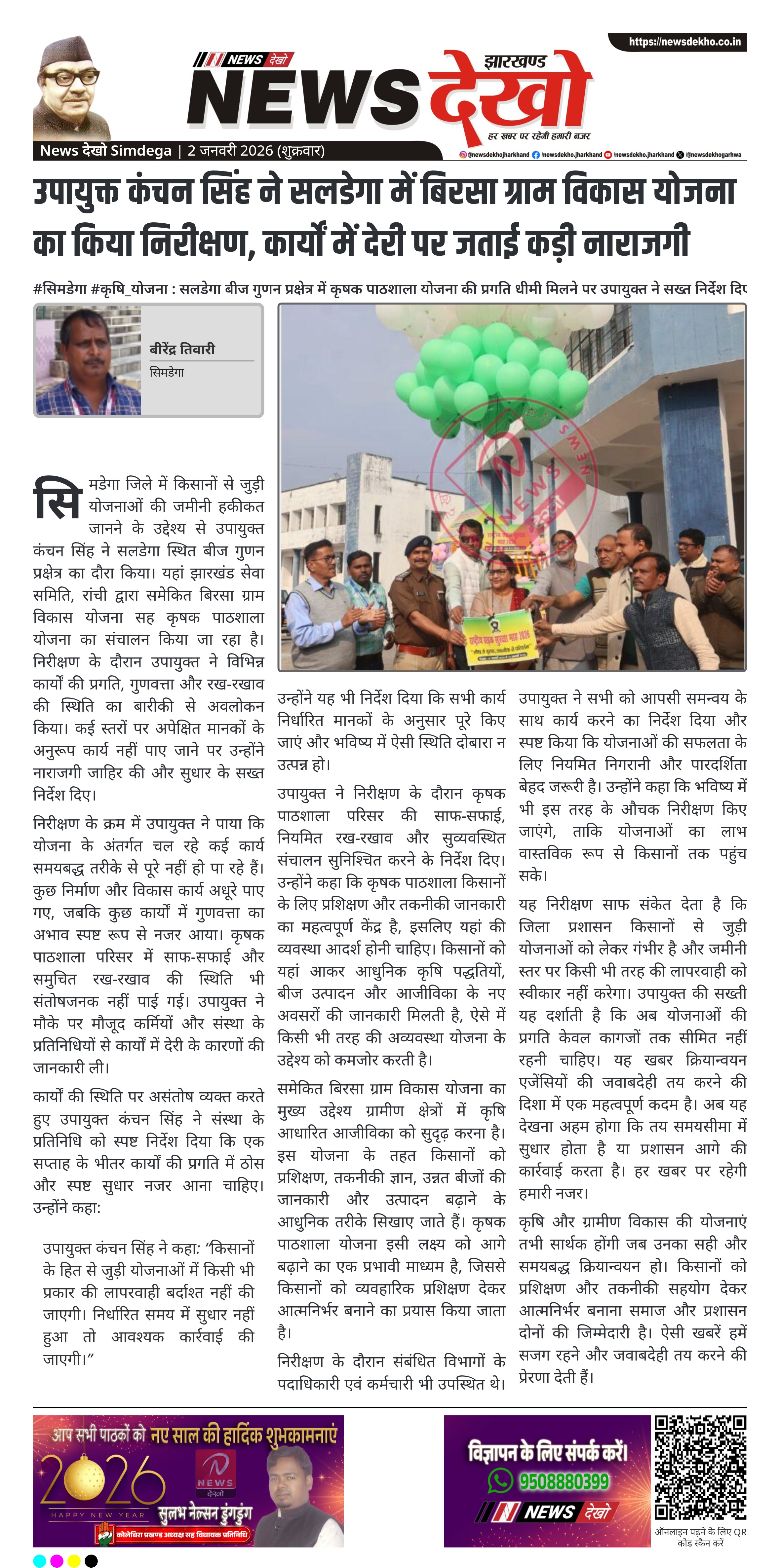 सिमडेगा जिले के सलडेगा स्थित बीज गुणन प्रक्षेत्र में उपायुक्त कंचन सिंह ने समेकित बिरसा ग्राम विकास योजना सह कृषक पाठशाला योजना का स्थल निरीक्षण किया। निरीक्षण के दौरान योजनांतर्गत चल रहे कार्यों की प्रगति अपेक्षित स्तर से कम पाई गई, जिस पर उपायुक्त ने नाराजगी व्यक्त की। उन्होंने क्रियान्वयन एजेंसी को एक सप्ताह में ठोस सुधार का निर्देश देते हुए चेतावनी दी। यह निरीक्षण किसानों को प्रशिक्षण और आजीविका सशक्तिकरण से जुड़ी योजनाओं की गुणवत्ता सुनिश्चित करने के उद्देश्य से किया गया।