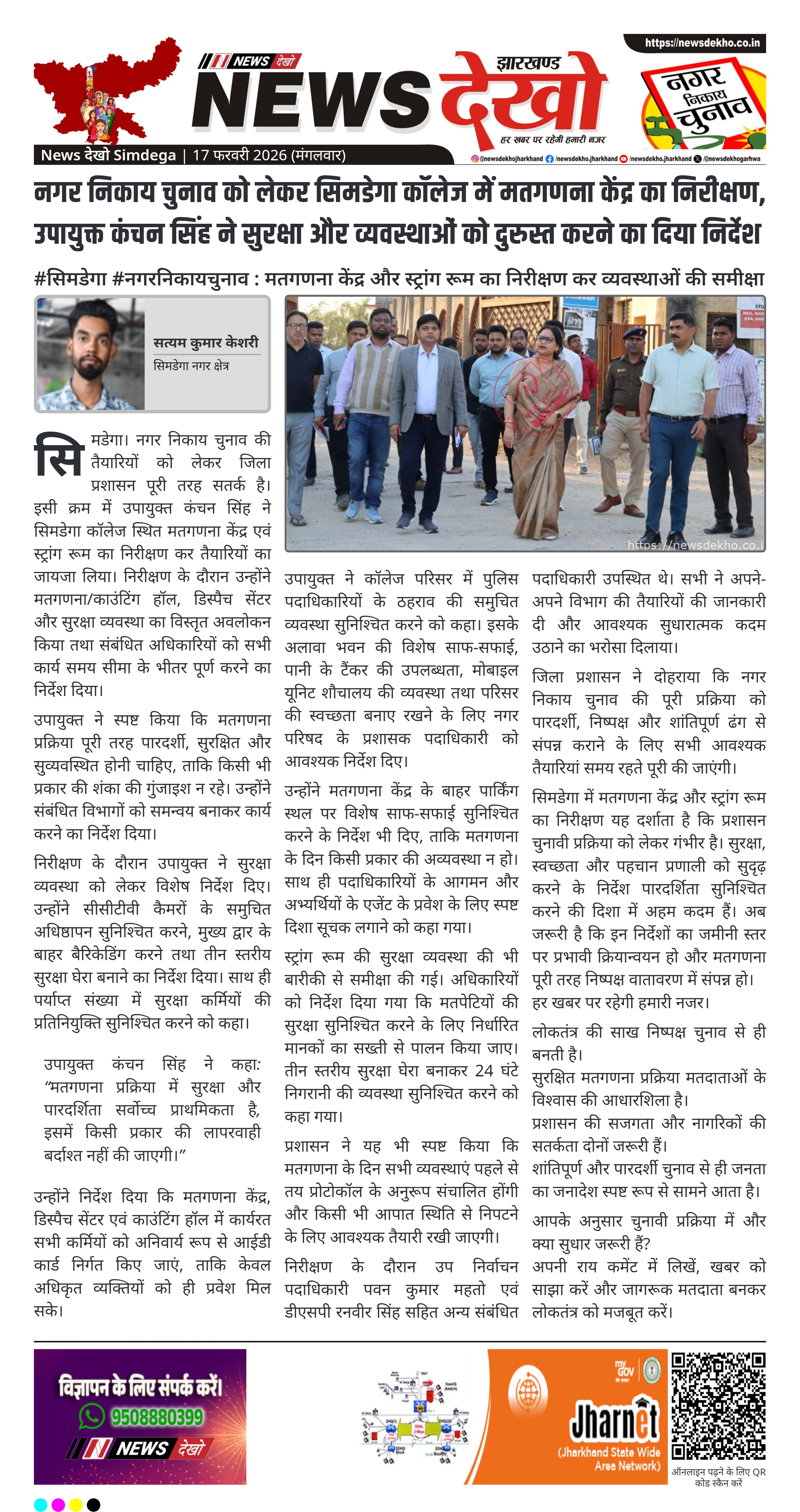 सिमडेगा में नगर निकाय चुनाव की तैयारियों के तहत उपायुक्त कंचन सिंह ने सिमडेगा कॉलेज स्थित मतगणना केंद्र और स्ट्रांग रूम का निरीक्षण किया। उन्होंने काउंटिंग हॉल, डिस्पैच सेंटर और सुरक्षा व्यवस्था की समीक्षा करते हुए सभी कार्य समय सीमा में पूरा करने का निर्देश दिया। परिसर में साफ-सफाई, पेयजल, शौचालय और सुरक्षा प्रबंधों को दुरुस्त करने पर विशेष जोर दिया गया। प्रशासन ने निष्पक्ष और सुव्यवस्थित मतगणना सुनिश्चित करने की प्रतिबद्धता दोहराई।