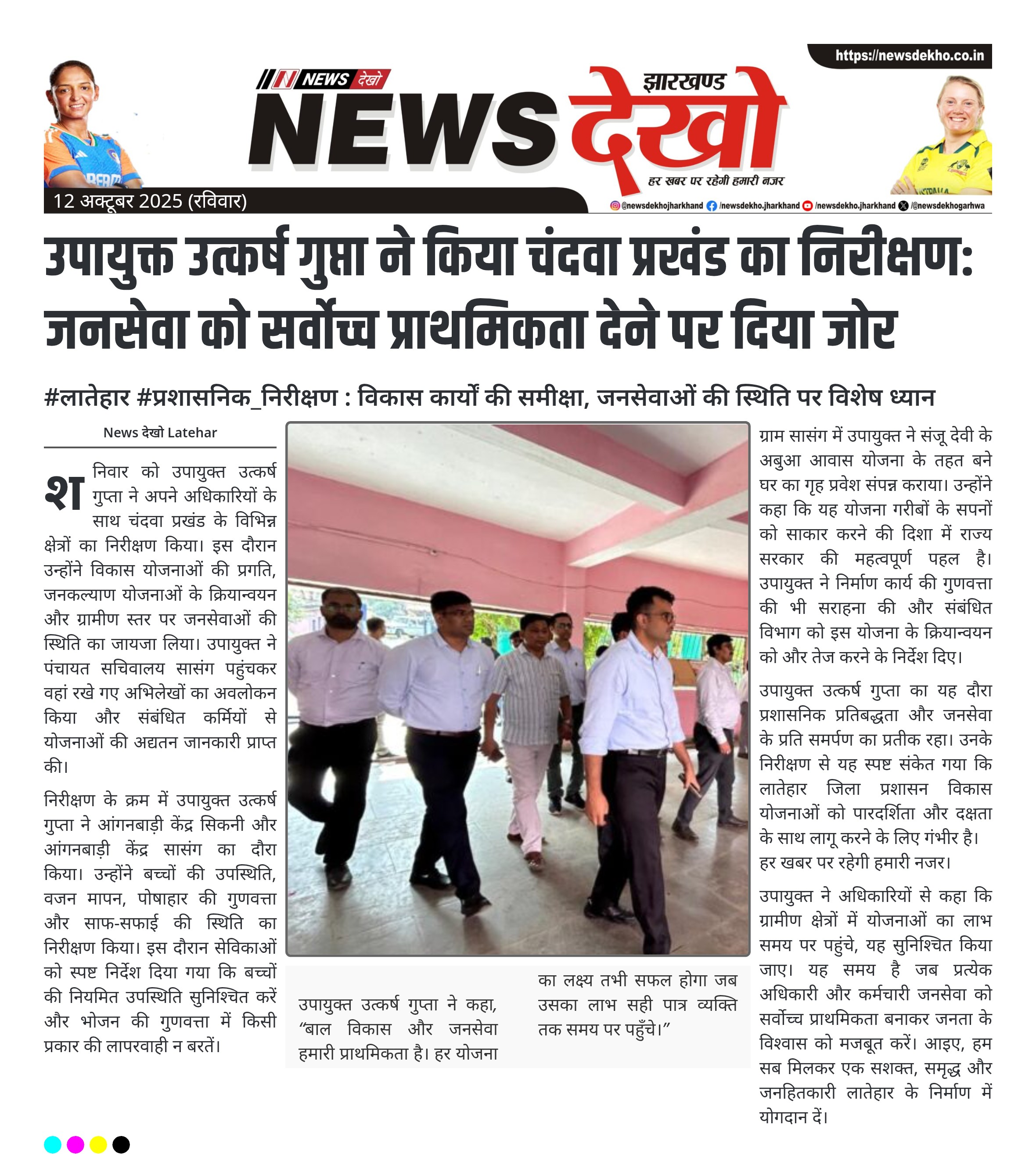 उपायुक्त उत्कर्ष गुप्ता का यह दौरा प्रशासनिक प्रतिबद्धता और जनसेवा के प्रति समर्पण का प्रतीक रहा। उनके निरीक्षण से यह स्पष्ट संकेत गया कि लातेहार जिला प्रशासन विकास योजनाओं को पारदर्शिता और दक्षता के साथ लागू करने के लिए गंभीर है।
