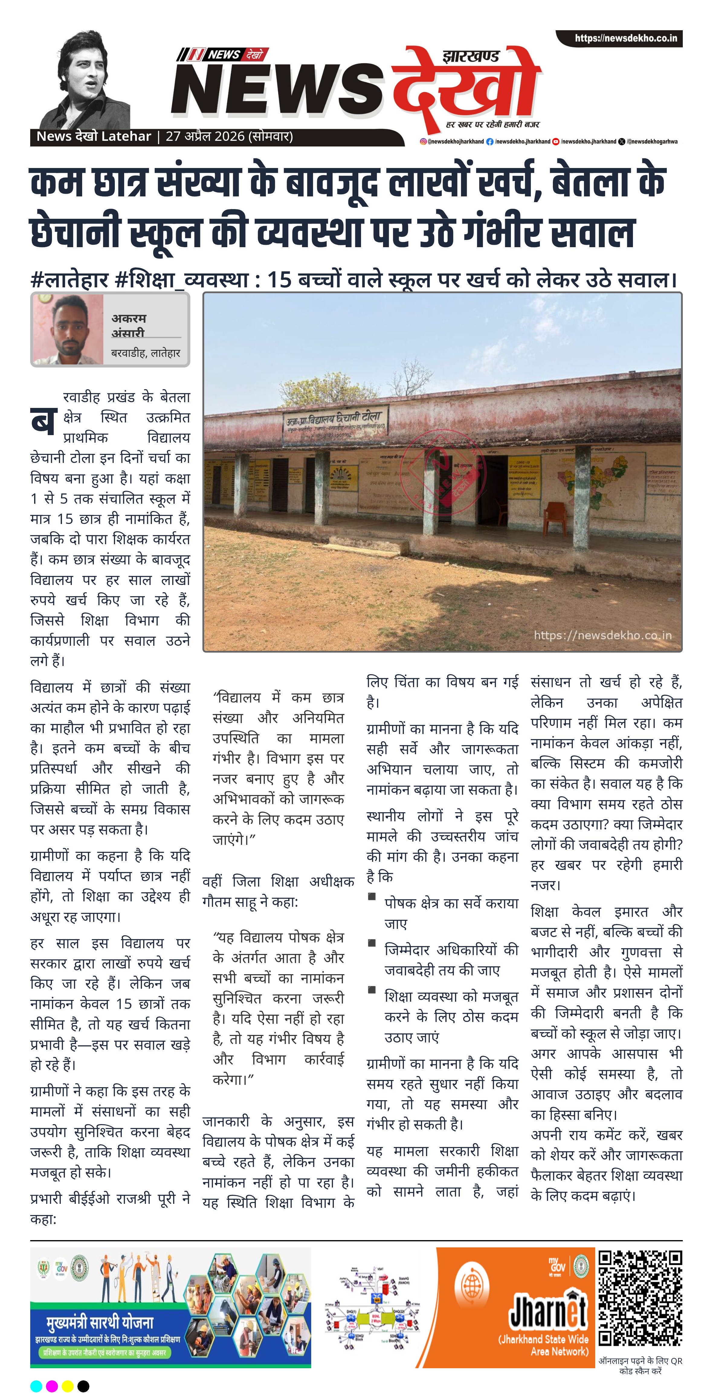 लातेहार जिले के बरवाडीह प्रखंड स्थित उत्क्रमित प्राथमिक विद्यालय छेचानी टोला में बेहद कम छात्र संख्या ने शिक्षा व्यवस्था पर गंभीर सवाल खड़े कर दिए हैं। महज 15 बच्चों वाले इस स्कूल पर हर साल लाखों रुपये खर्च हो रहे हैं। स्थानीय ग्रामीणों और अधिकारियों ने इसे गंभीर मुद्दा बताते हुए सुधार की आवश्यकता जताई है। विभाग ने भी मामले की निगरानी और सुधारात्मक कदम उठाने का आश्वासन दिया है।