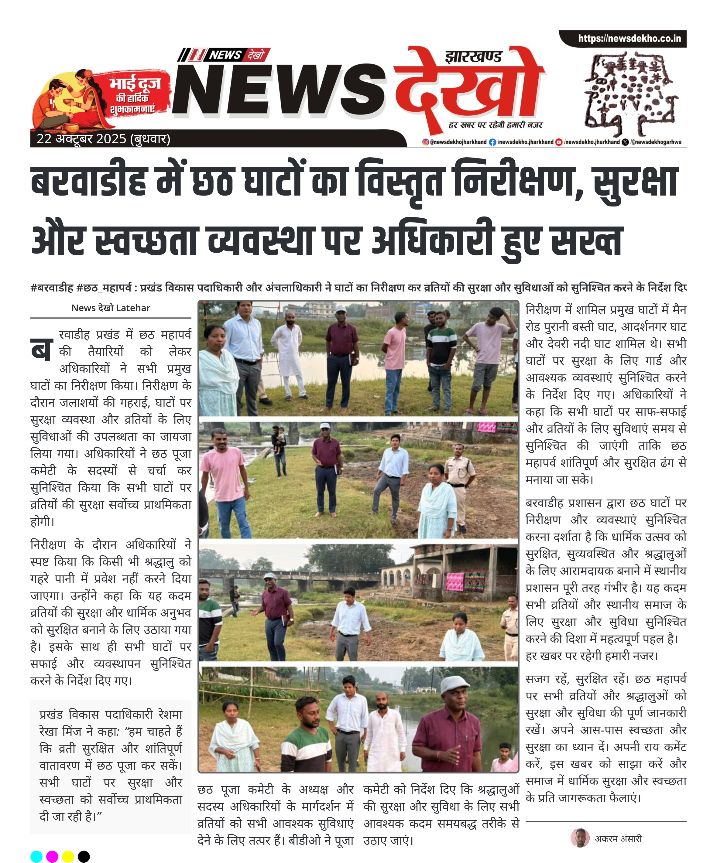 - प्रखंड विकास पदाधिकारी रेशमा रेखा मिंज और अंचलाधिकारी लवकेश सिंह ने बरवाडीह प्रखंड के प्रमुख छठ घाटों का संयुक्त निरीक्षण किया।