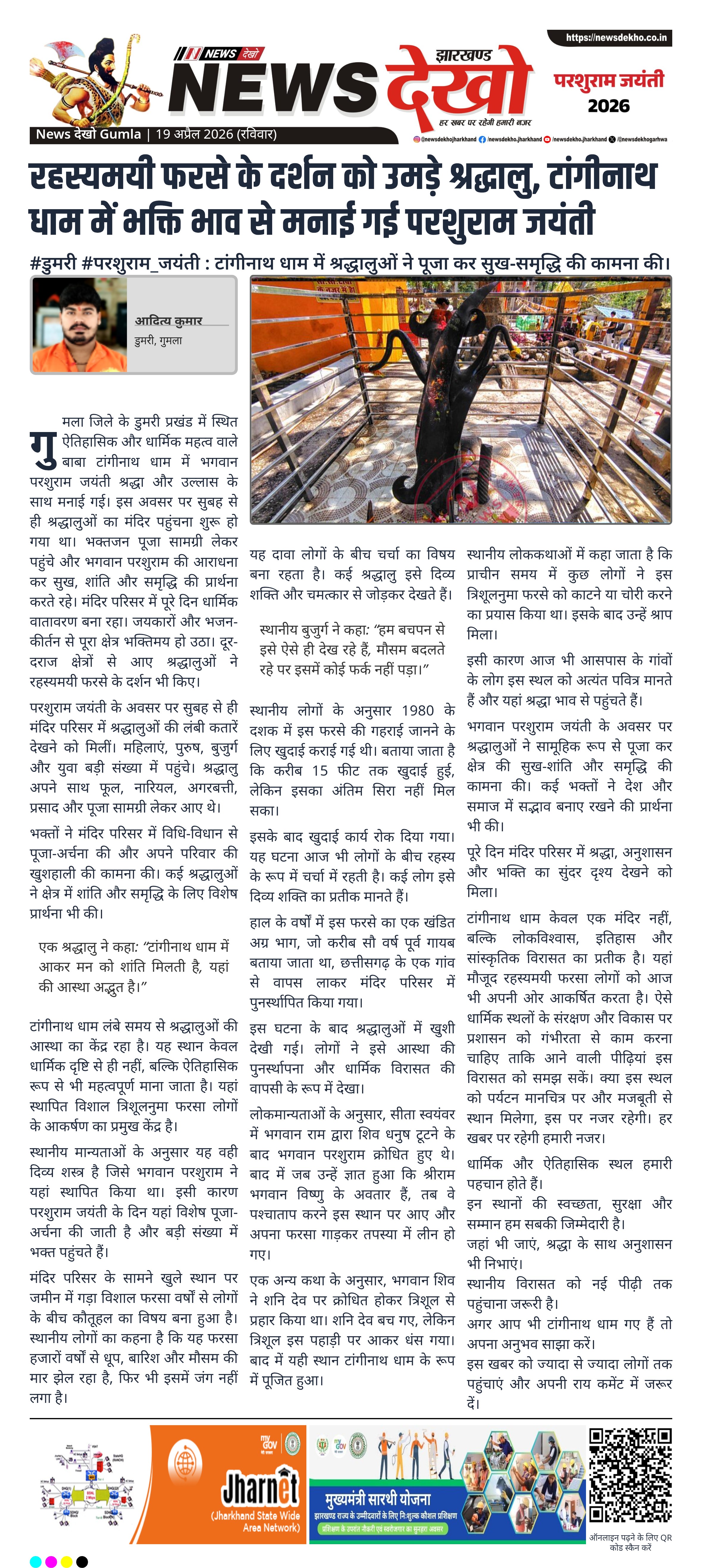 गुमला जिले के डुमरी प्रखंड में स्थित ऐतिहासिक और धार्मिक महत्व वाले बाबा टांगीनाथ धाम में भगवान परशुराम जयंती श्रद्धा और उल्लास के साथ मनाई गई। इस अवसर पर सुबह से ही श्रद्धालुओं का मंदिर पहुंचना शुरू हो गया था। भक्तजन पूजा सामग्री लेकर पहुंचे और भगवान परशुराम की आराधना कर सुख, शांति और समृद्धि की प्रार्थना करते रहे। मंदिर परिसर में पूरे दिन धार्मिक वातावरण बना रहा। जयकारों और भजन-कीर्तन से पूरा क्षेत्र भक्तिमय हो उठा। दूर-दराज क्षेत्रों से आए श्रद्धालुओं ने रहस्यमयी फरसे के दर्शन भी किए।