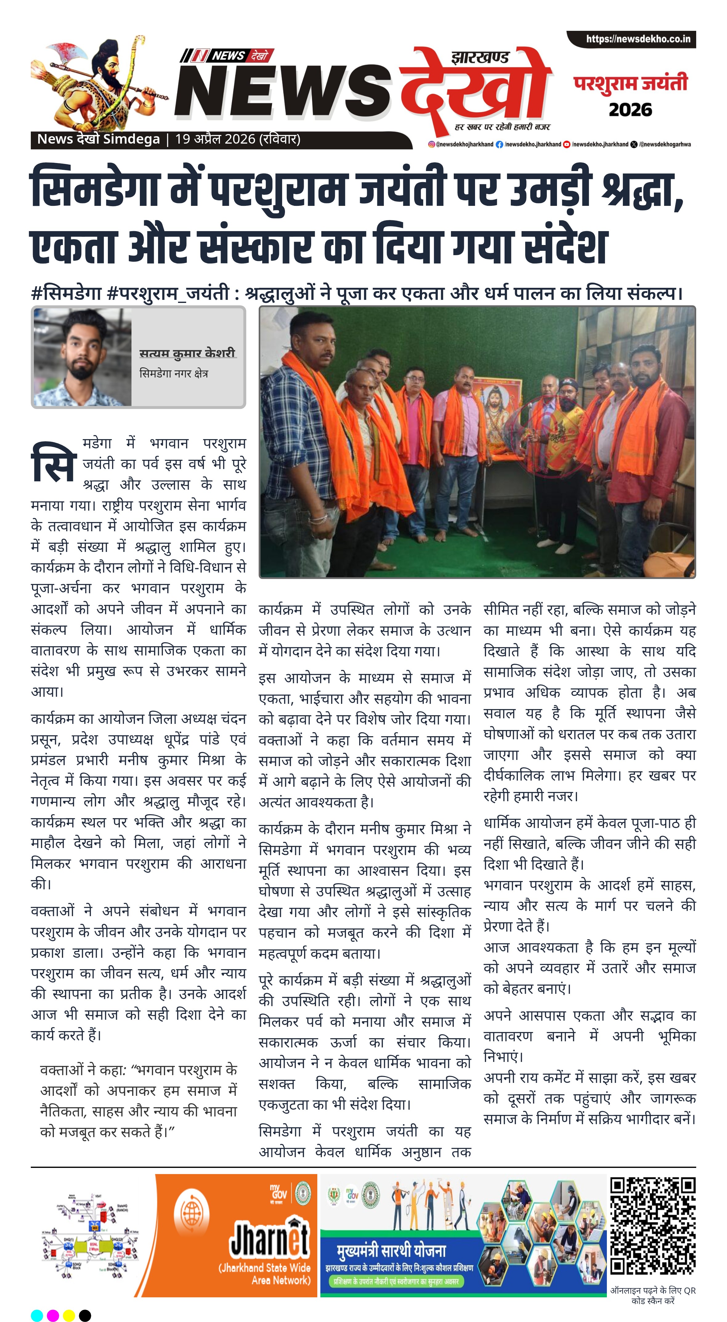 - सिमडेगा में भगवान परशुराम की भव्य मूर्ति स्थापना का आश्वासन।