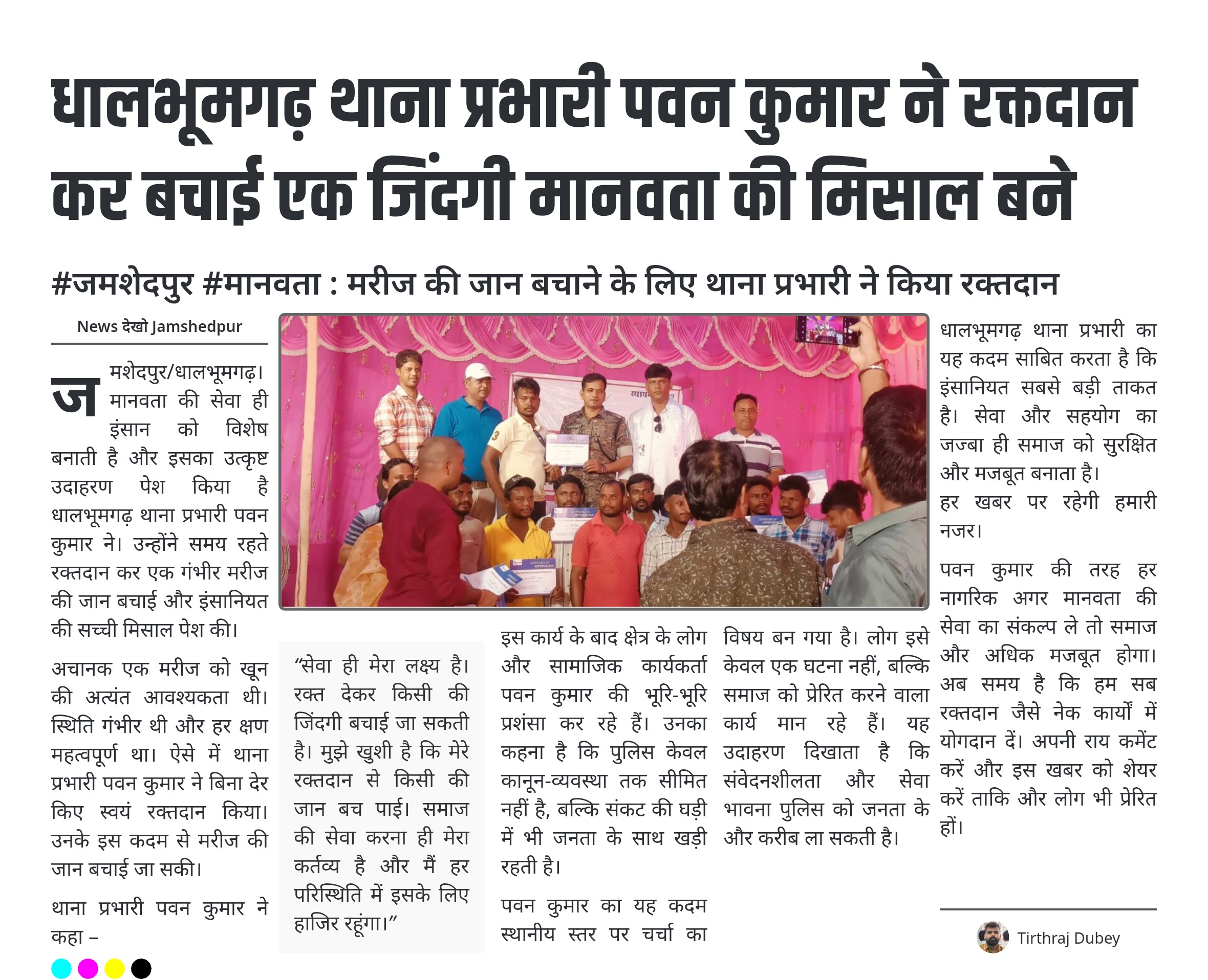 • धालभूमगढ़ थाना प्रभारी पवन कुमार ने जरूरतमंद मरीज को रक्तदान किया।