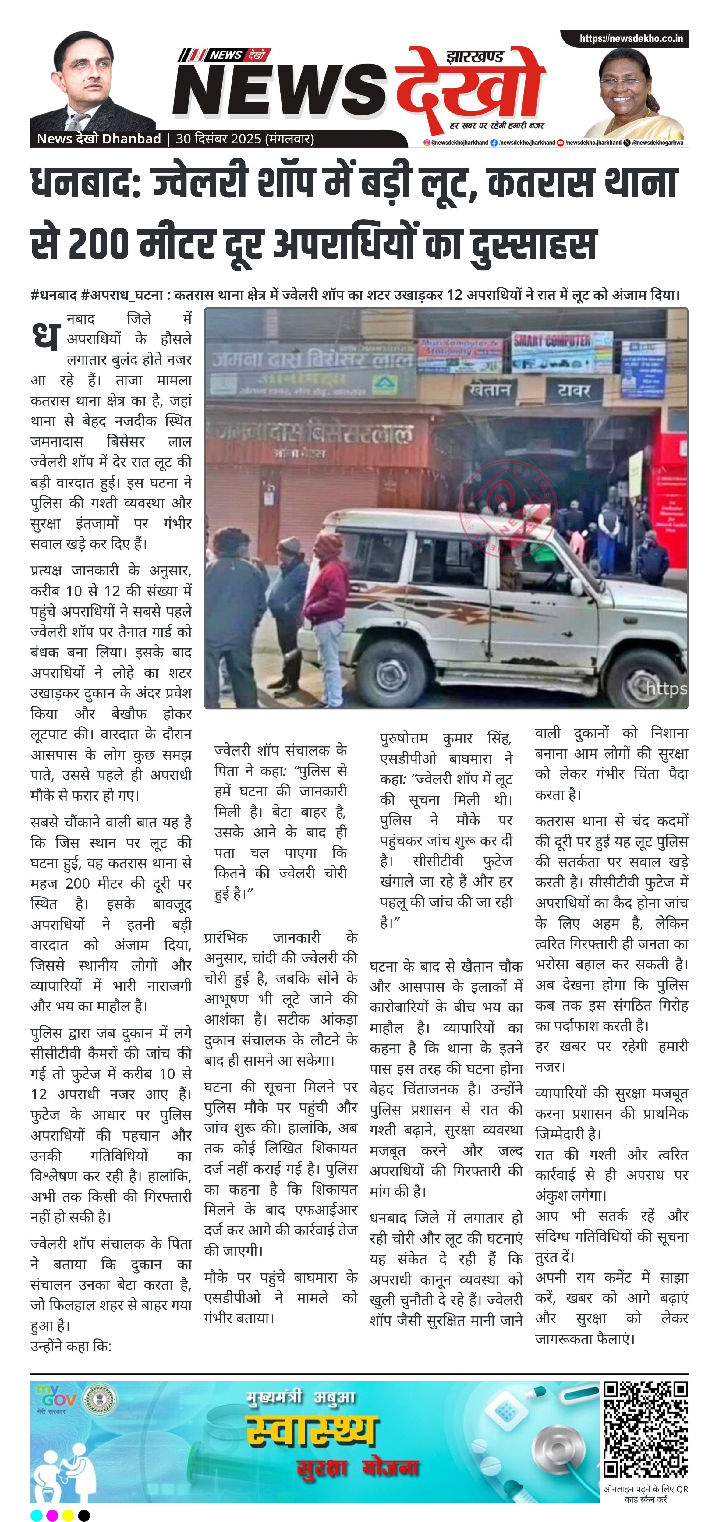 धनबाद जिले में लगातार हो रही चोरी और लूट की घटनाएं यह संकेत दे रही हैं कि अपराधी कानून व्यवस्था को खुली चुनौती दे रहे हैं। ज्वेलरी शॉप जैसी सुरक्षित मानी जाने वाली दुकानों को निशाना बनाना आम लोगों की सुरक्षा को लेकर गंभीर चिंता पैदा करता है।