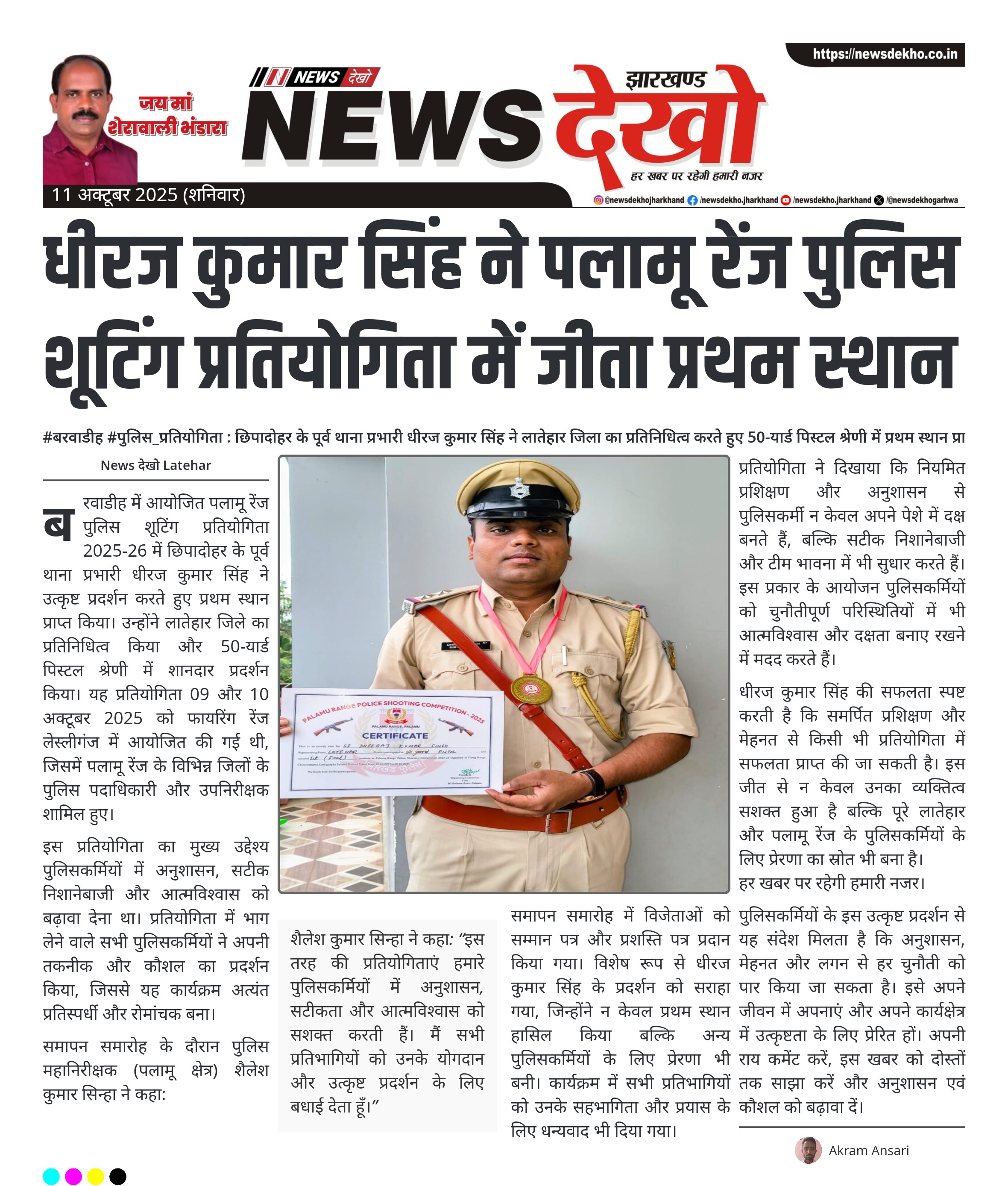 #बरवाडीह #पुलिस_प्रतियोगिता : छिपादोहर के पूर्व थाना प्रभारी धीरज कुमार सिंह ने लातेहार जिला का प्रतिनिधित्व करते हुए 50-यार्ड पिस्टल श्रेणी में प्रथम स्थान प्राप्त किया