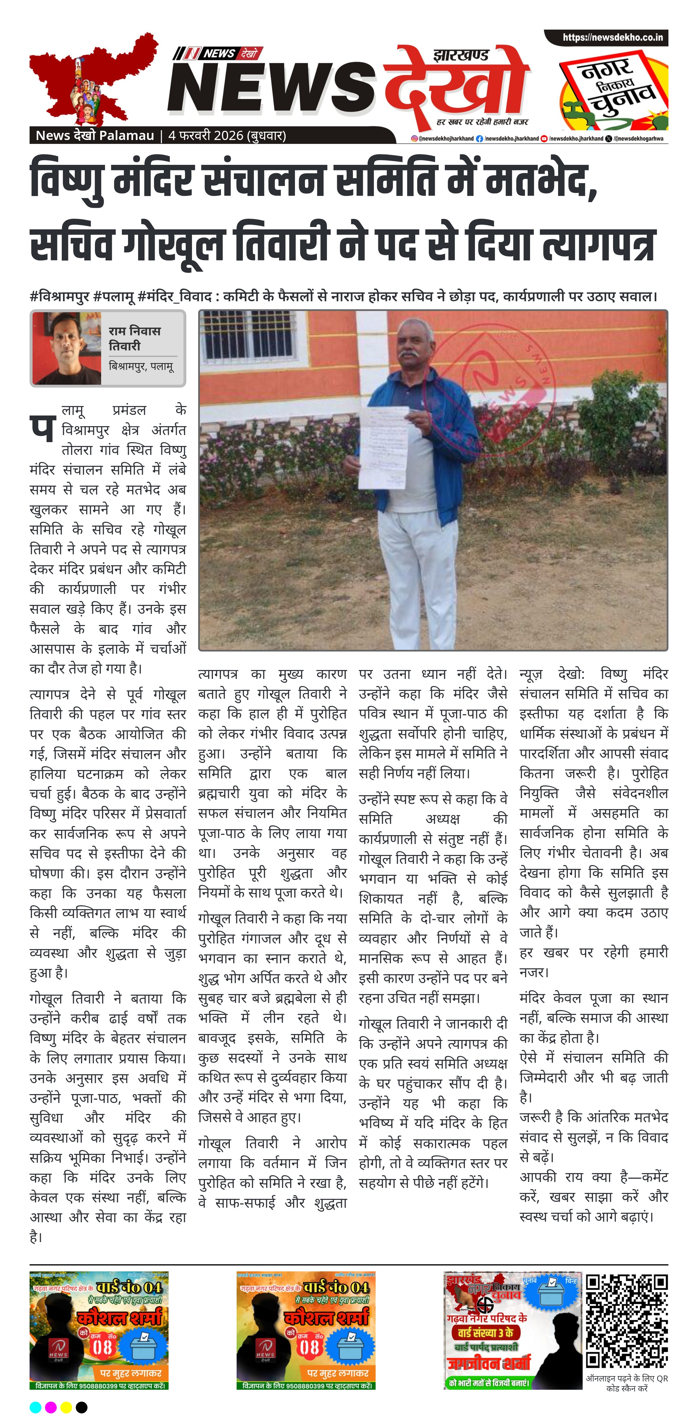 पलामू जिले के विश्रामपुर अंतर्गत तोलरा गांव स्थित विष्णु मंदिर संचालन समिति में उस समय विवाद गहरा गया, जब समिति के सचिव गोखूल तिवारी ने अपने पद से त्यागपत्र दे दिया। उन्होंने समिति के कुछ फैसलों को गलत बताते हुए सार्वजनिक रूप से असंतोष जाहिर किया। गांव स्तर पर बैठक के बाद मंदिर परिसर में आयोजित प्रेसवार्ता में उन्होंने अपने निर्णय की घोषणा की। यह मामला मंदिर संचालन, पुरोहित नियुक्ति और आंतरिक मतभेदों से जुड़ा हुआ है, जो अब सार्वजनिक चर्चा का विषय बन गया है।