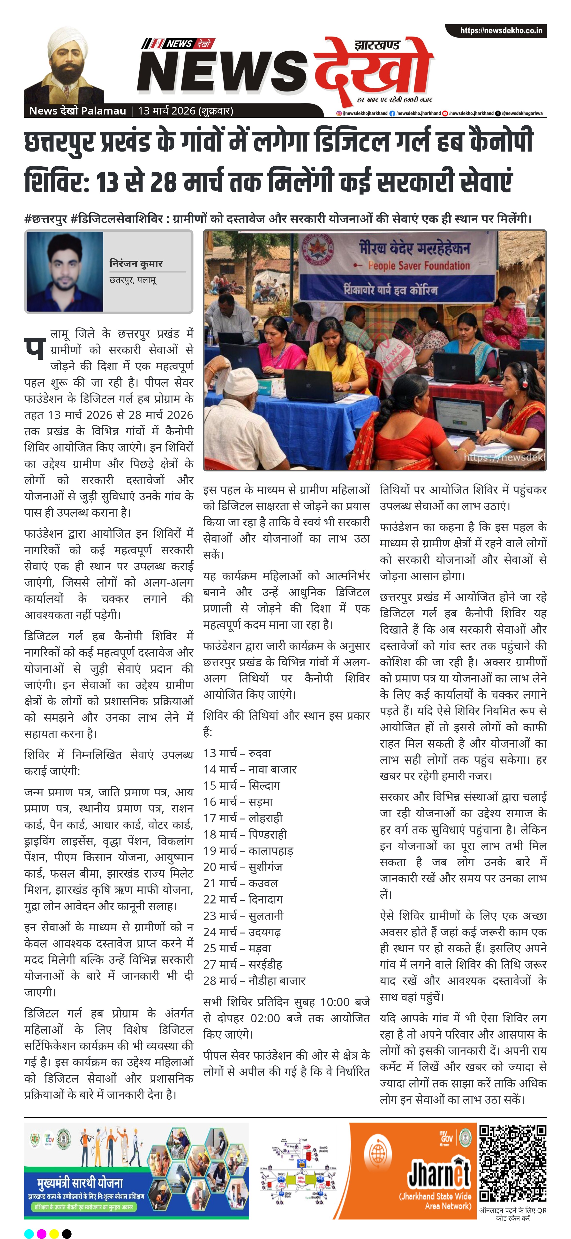 पलामू जिले के छत्तरपुर प्रखंड में ग्रामीणों को सरकारी सेवाओं से जोड़ने की दिशा में एक महत्वपूर्ण पहल शुरू की जा रही है। पीपल सेवर फाउंडेशन के डिजिटल गर्ल हब प्रोग्राम के तहत 13 मार्च 2026 से 28 मार्च 2026 तक प्रखंड के विभिन्न गांवों में कैनोपी शिविर आयोजित किए जाएंगे। इन शिविरों का उद्देश्य ग्रामीण और पिछड़े क्षेत्रों के लोगों को सरकारी दस्तावेजों और योजनाओं से जुड़ी सुविधाएं उनके गांव के पास ही उपलब्ध कराना है।