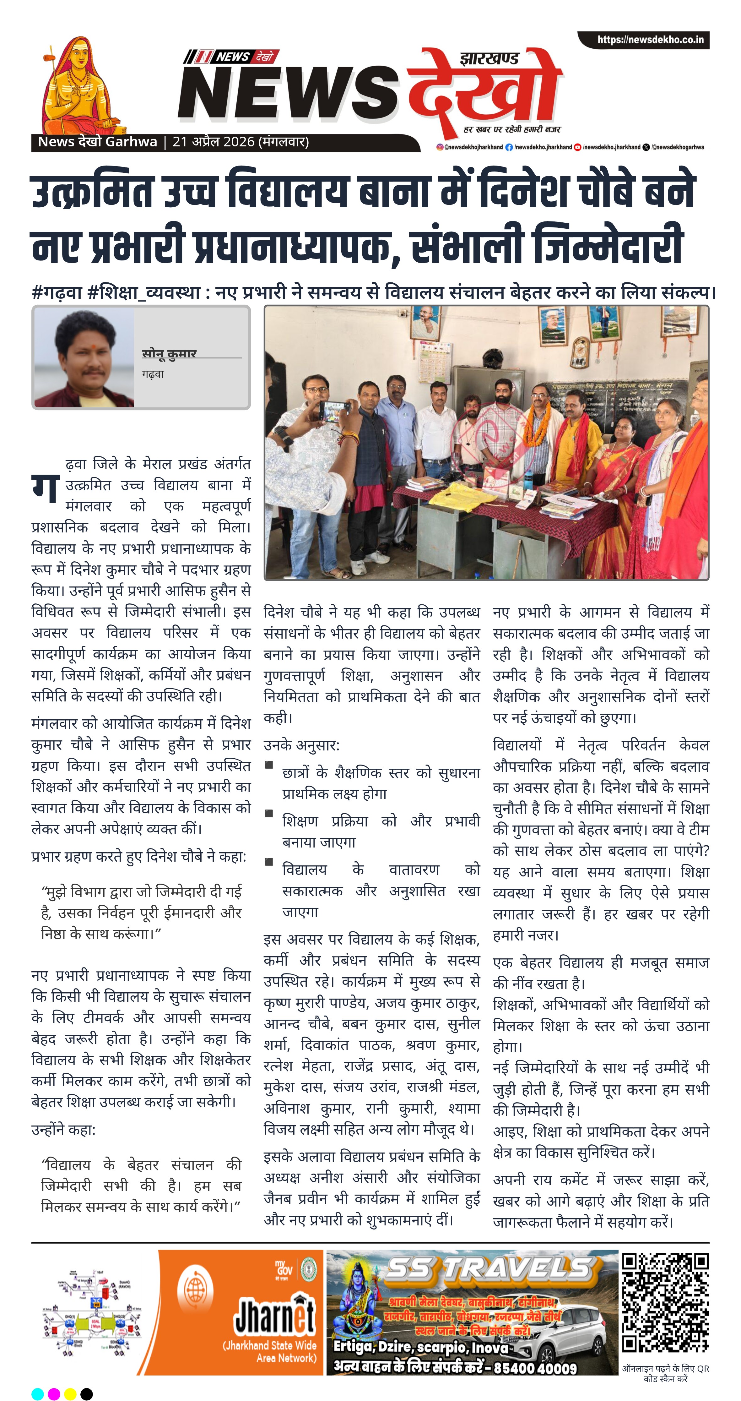 गढ़वा जिले के मेराल प्रखंड स्थित उत्क्रमित उच्च विद्यालय बाना में दिनेश कुमार चौबे को नया प्रभारी प्रधानाध्यापक नियुक्त किया गया है। उन्होंने मंगलवार को आसिफ हुसैन से औपचारिक रूप से प्रभार ग्रहण किया। इस अवसर पर विद्यालय के शिक्षकों और कर्मियों की उपस्थिति में बेहतर संचालन और समन्वय से कार्य करने का संकल्प लिया गया। नए प्रभारी ने उपलब्ध संसाधनों के बीच गुणवत्तापूर्ण शिक्षा पर जोर दिया।