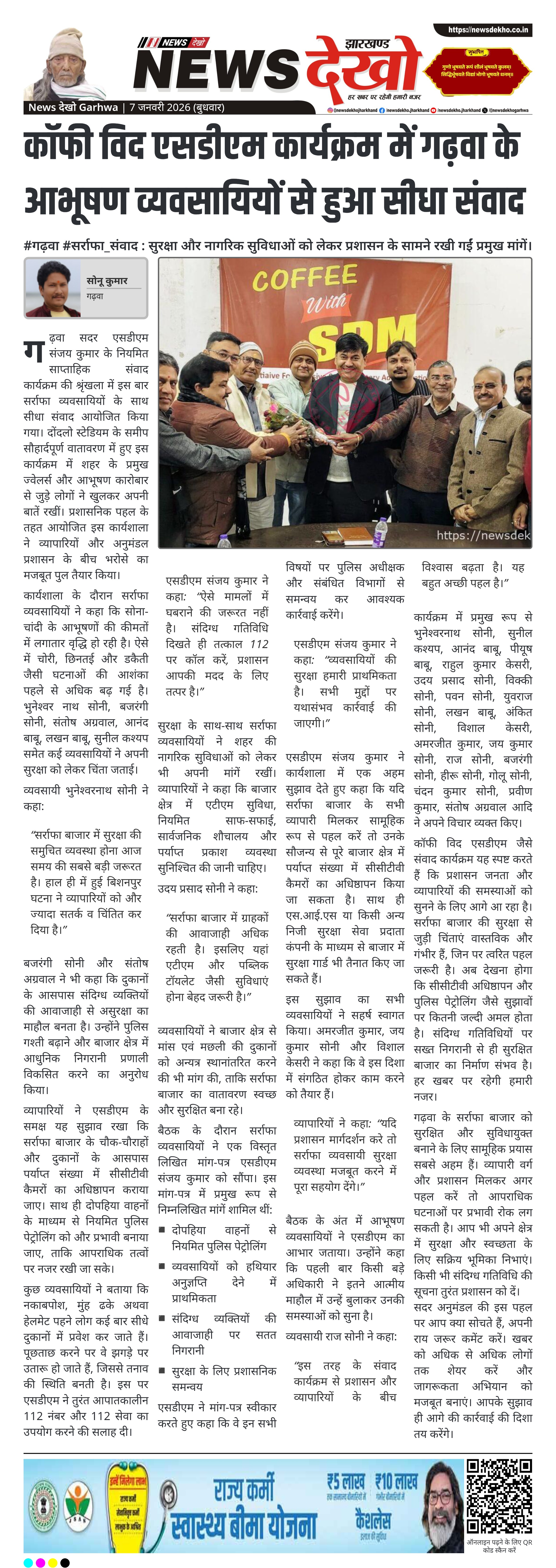 गढ़वा सदर अनुमंडल प्रशासन द्वारा बुधवार को संवाद कार्यक्रम कॉफी विद एसडीएम आयोजित किया गया। इस बैठक में सर्राफा और आभूषण व्यवसाय से जुड़े 30 से अधिक व्यापारियों ने भाग लेकर अपनी समस्याएं प्रशासन के समक्ष रखीं। कार्यशाला में बाजार सुरक्षा, सीसीटीवी कैमरा अधिष्ठापन और पुलिस पेट्रोलिंग को प्रभावी बनाने पर गंभीर चर्चा हुई। प्रशासन और व्यवसायियों के बीच सामूहिक सहभागिता से सुरक्षा व्यवस्था मजबूत करने पर सहमति बनी।