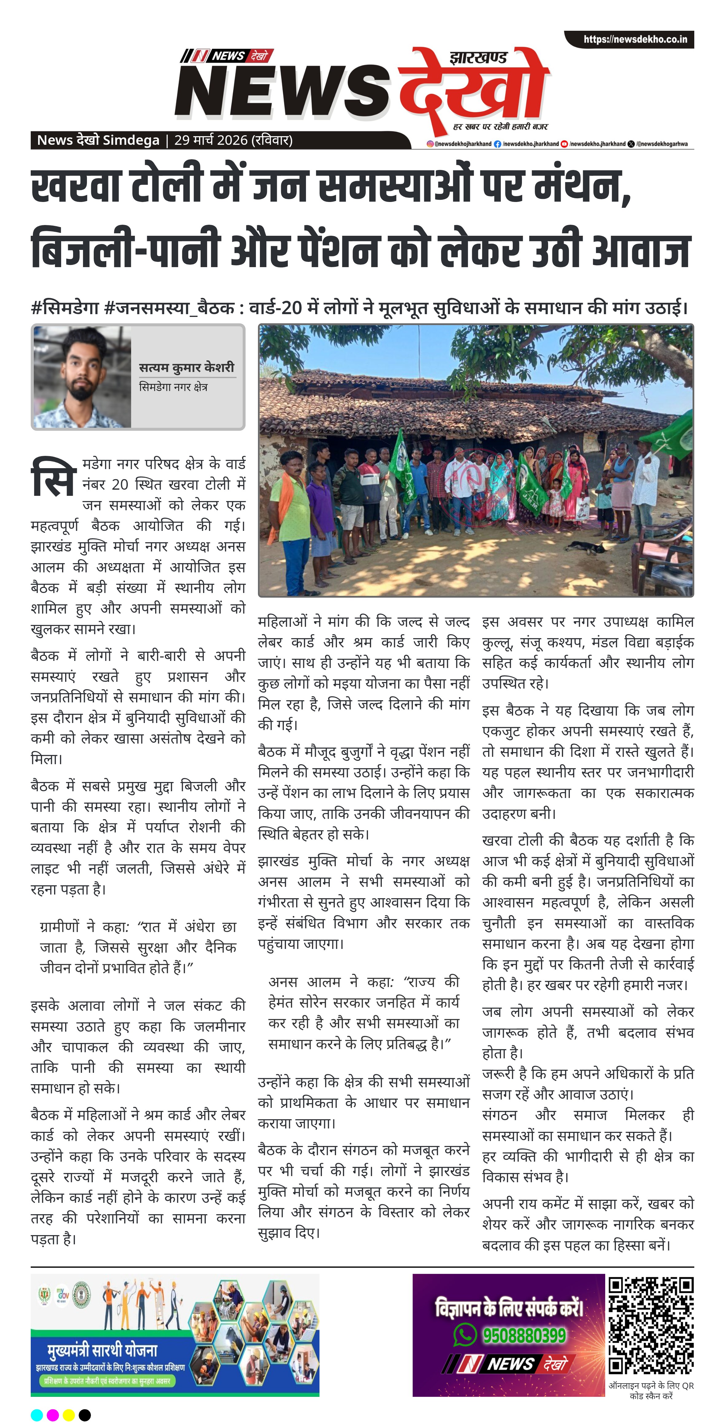 सिमडेगा नगर परिषद के वार्ड-20 स्थित खरवा टोली में जन समस्याओं को लेकर बैठक आयोजित की गई। इसमें स्थानीय लोगों ने बिजली, पानी, पेंशन और श्रम कार्ड से जुड़ी समस्याएं उठाईं। बैठक की अध्यक्षता झारखंड मुक्ति मोर्चा नगर अध्यक्ष अनस आलम ने की। उन्होंने समस्याओं को सरकार तक पहुंचाकर समाधान का आश्वासन दिया।