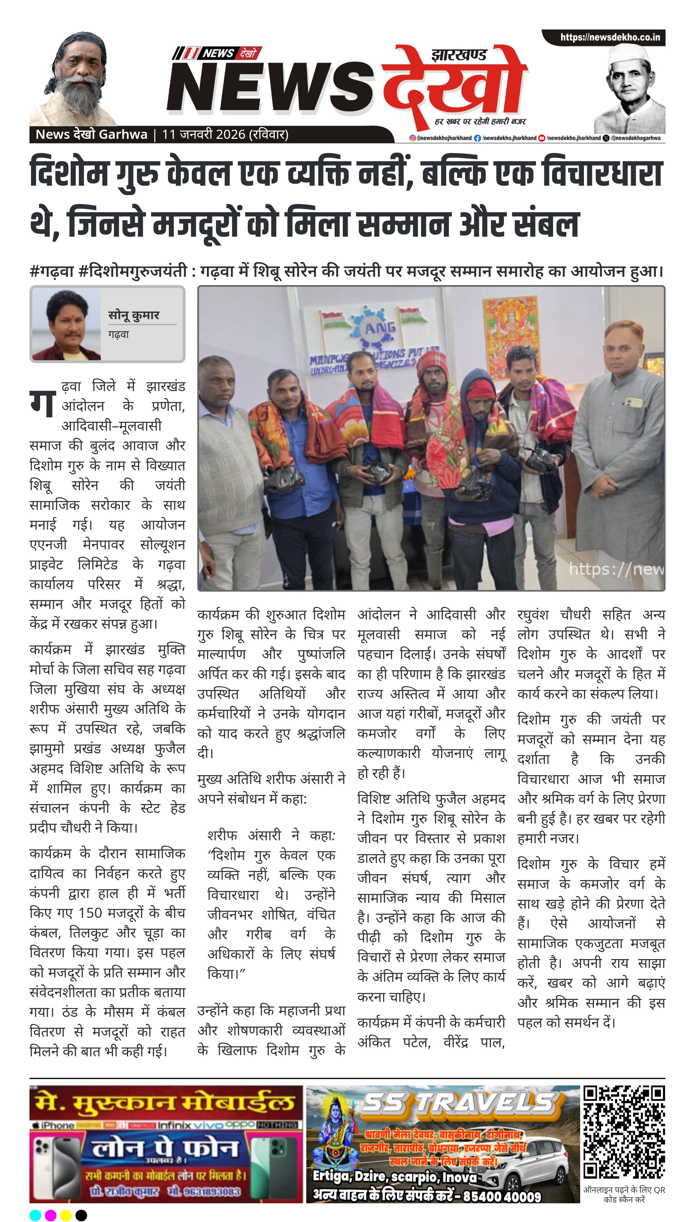 दिशोम गुरु की जयंती पर मजदूरों को सम्मान देना यह दर्शाता है कि उनकी विचारधारा आज भी समाज और श्रमिक वर्ग के लिए प्रेरणा बनी हुई है। हर खबर पर रहेगी हमारी नजर।