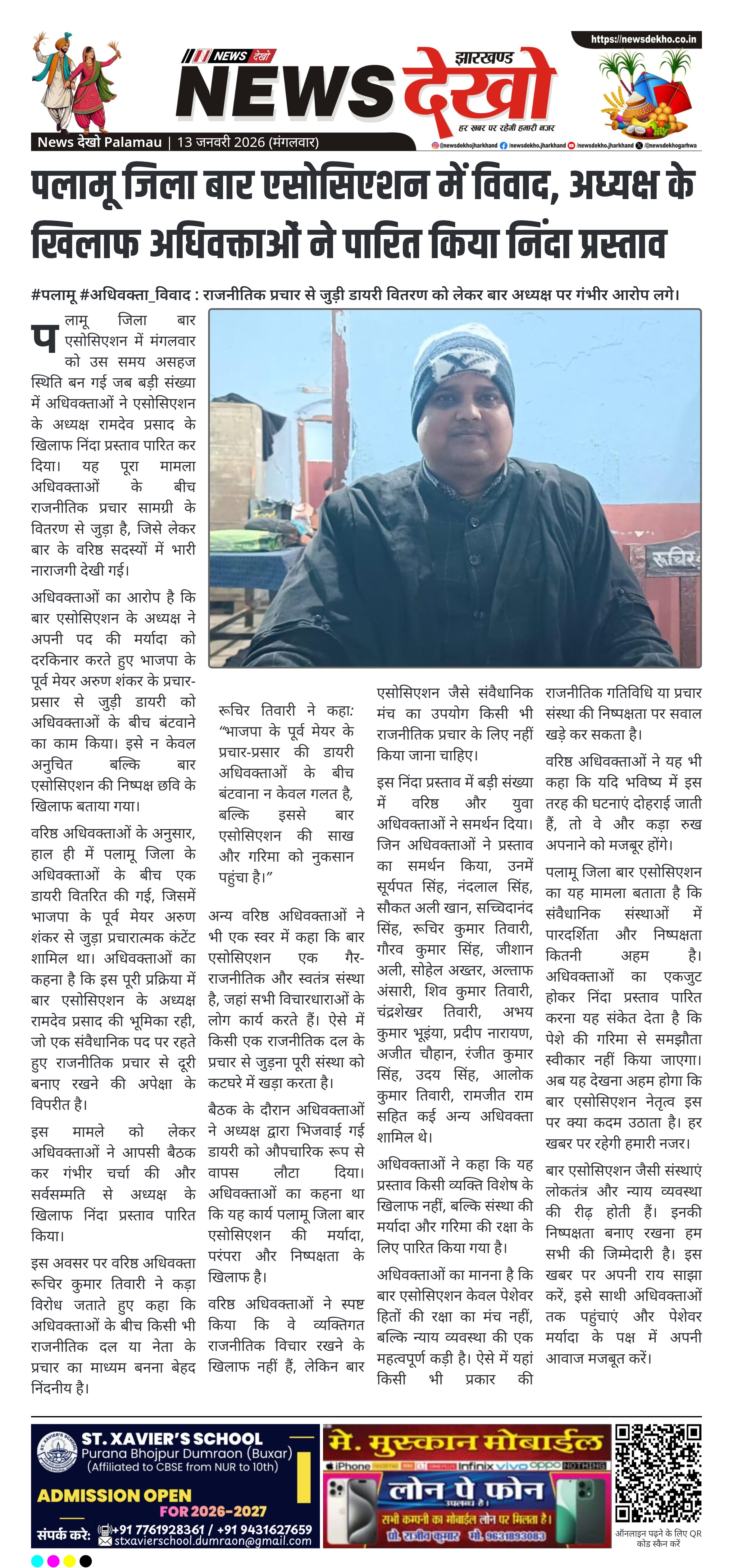 पलामू जिला बार एसोसिएशन में उस समय विवाद गहराया जब वरिष्ठ अधिवक्ताओं ने अध्यक्ष रामदेव प्रसाद के खिलाफ निंदा प्रस्ताव पारित किया। आरोप है कि अध्यक्ष ने भाजपा के पूर्व मेयर अरुण शंकर के प्रचार से जुड़ी डायरी अधिवक्ताओं के बीच वितरित करवाई। अधिवक्ताओं ने इसे बार की गरिमा के खिलाफ बताते हुए डायरी वापस कर दी। यह मामला वकालत पेशे की निष्पक्षता और संस्थागत मर्यादा से जुड़ा माना जा रहा है।