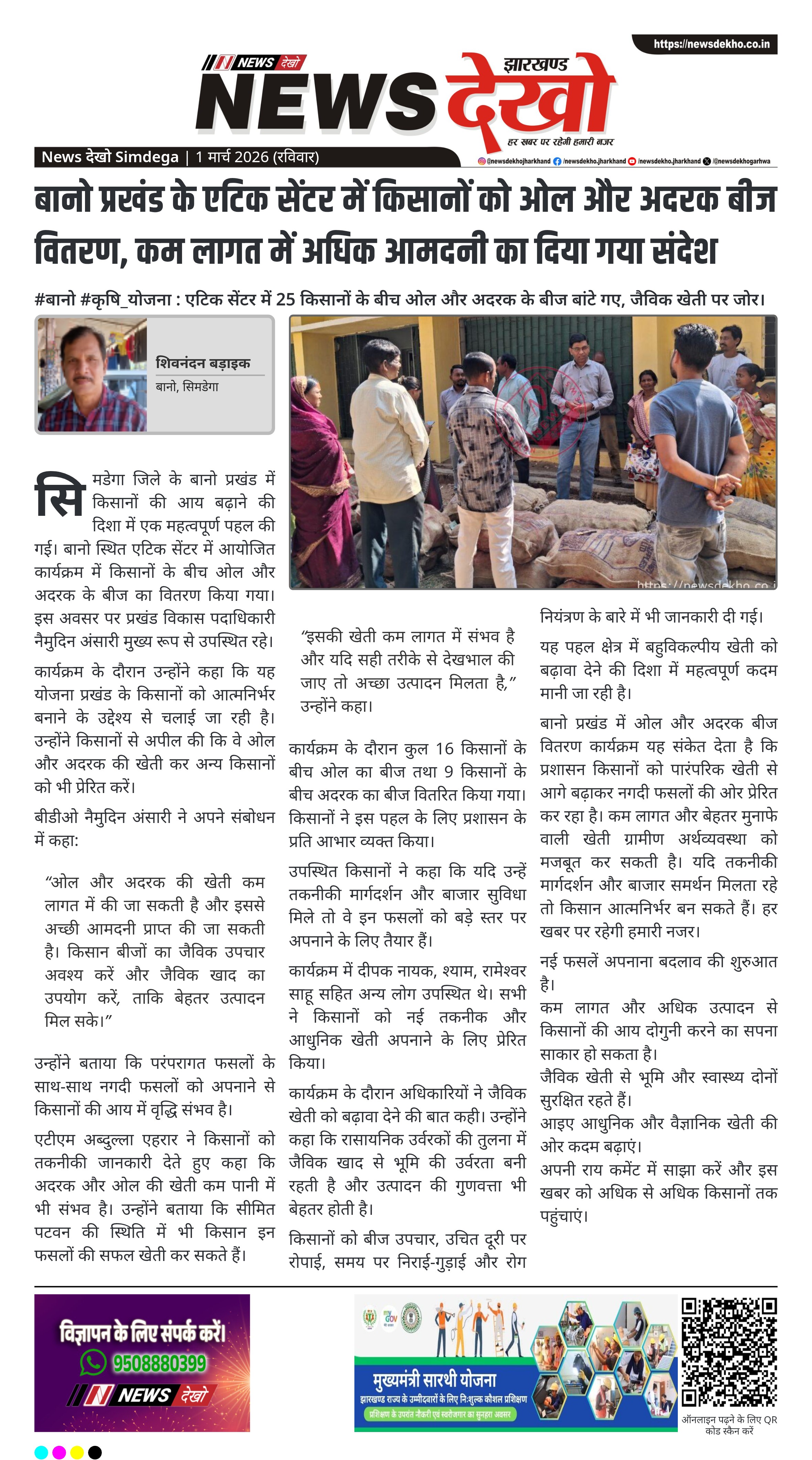 सिमडेगा जिले के बानो प्रखंड स्थित एटिक सेंटर में किसानों के बीच ओल और अदरक के बीज का वितरण किया गया। कार्यक्रम में प्रखंड विकास पदाधिकारी नैमुदिन अंसारी ने किसानों को कम लागत में अधिक आमदनी वाली खेती अपनाने की सलाह दी। कुल 25 किसानों को बीज उपलब्ध कराए गए और जैविक उपचार पर विशेष जोर दिया गया।