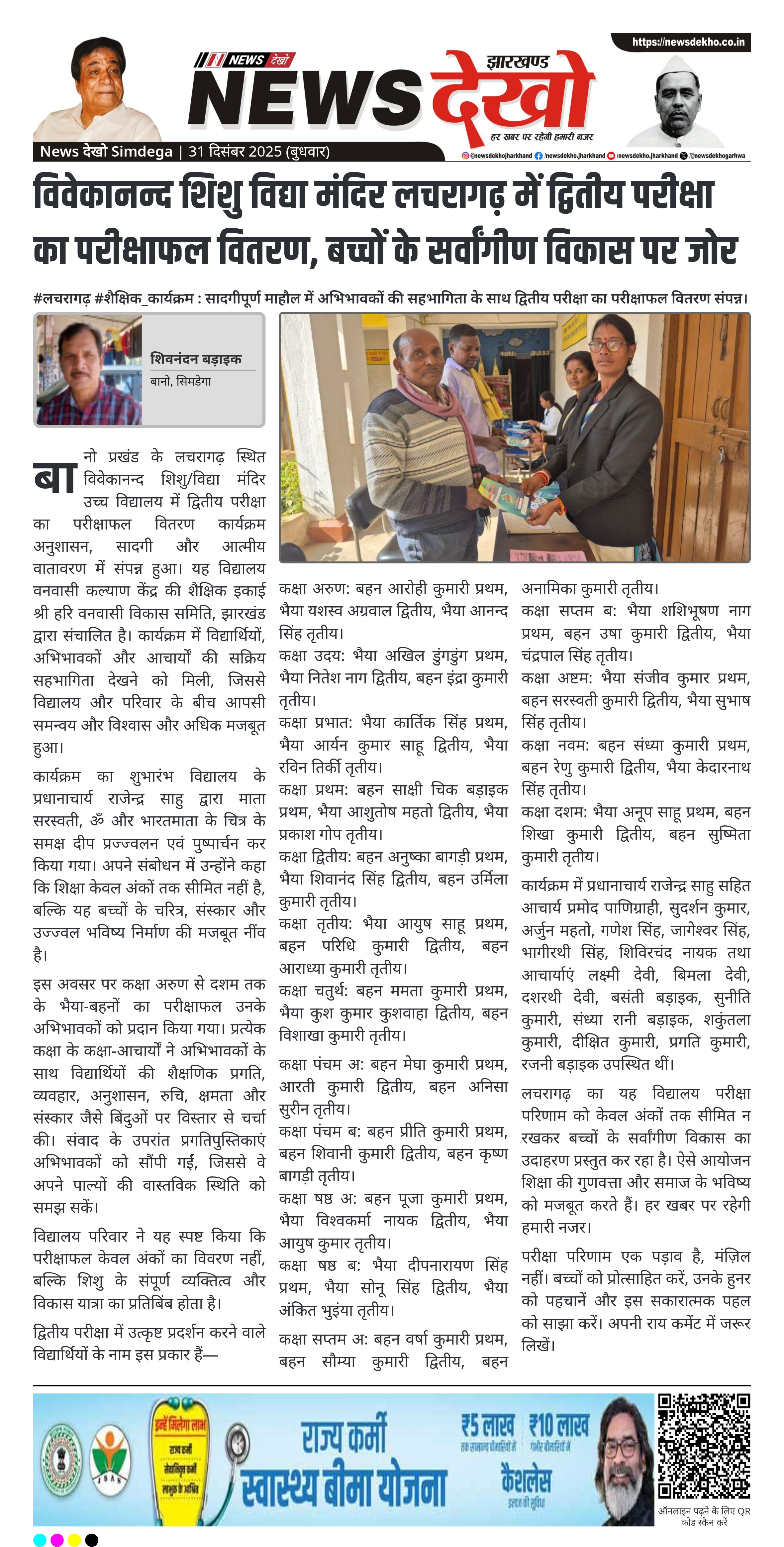 बानो प्रखंड के लचरागढ़ स्थित विवेकानन्द शिशु/विद्या मंदिर उच्च विद्यालय में द्वितीय परीक्षा का परीक्षाफल वितरण कार्यक्रम अनुशासन, सादगी और आत्मीय वातावरण में संपन्न हुआ। यह विद्यालय वनवासी कल्याण केंद्र की शैक्षिक इकाई श्री हरि वनवासी विकास समिति, झारखंड द्वारा संचालित है। कार्यक्रम में विद्यार्थियों, अभिभावकों और आचार्यों की सक्रिय सहभागिता देखने को मिली, जिससे विद्यालय और परिवार के बीच आपसी समन्वय और विश्वास और अधिक मजबूत हुआ।