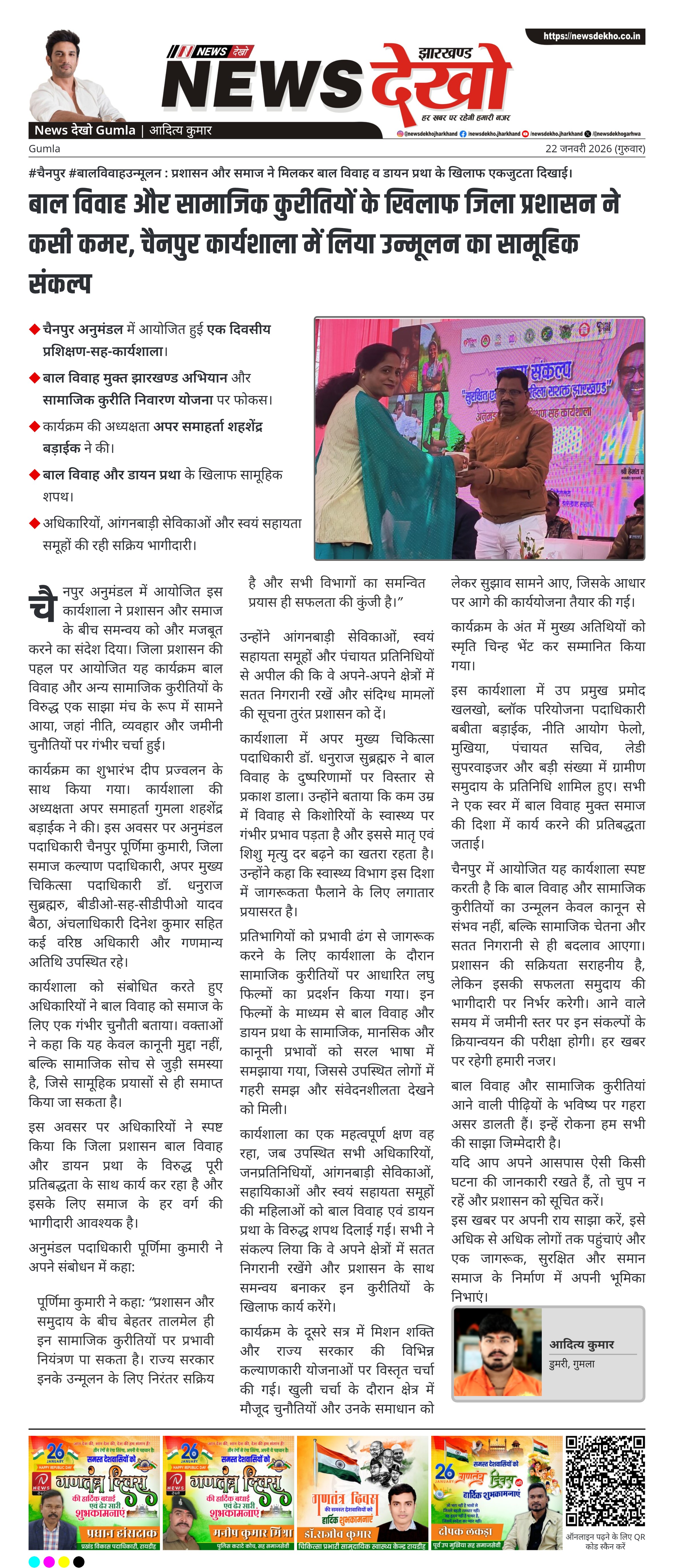 चैनपुर अनुमंडल में उपायुक्त प्रेरणा दीक्षित के निर्देशानुसार बाल विवाह मुक्त झारखण्ड अभियान के तहत एक दिवसीय प्रशिक्षण-सह-कार्यशाला का आयोजन किया गया। जिला प्रशासन और समाज कल्याण विभाग के संयुक्त तत्वावधान में हुए इस कार्यक्रम में बाल विवाह और डायन प्रथा जैसी सामाजिक कुरीतियों के उन्मूलन पर जोर दिया गया। कार्यशाला में प्रशासनिक अधिकारियों, जनप्रतिनिधियों और सामाजिक कार्यकर्ताओं ने एकजुट होकर सतत निगरानी और जन-जागरूकता का संकल्प लिया। यह आयोजन समाज के अंतिम व्यक्ति तक जागरूकता पहुंचाने की दिशा में महत्वपूर्ण कदम माना जा रहा है।