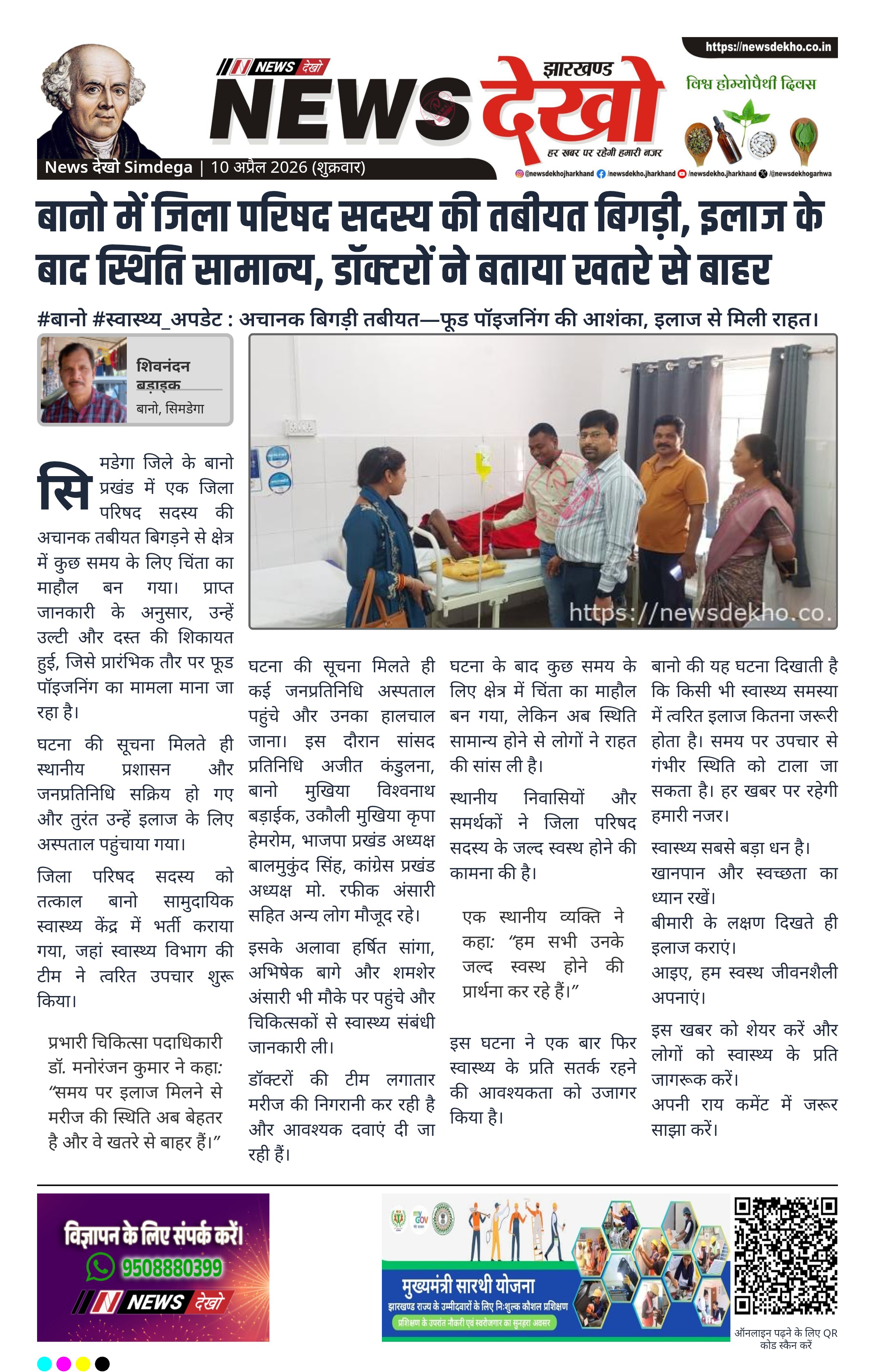 सिमडेगा जिले के बानो प्रखंड में एक जिला परिषद सदस्य की अचानक तबीयत बिगड़ने से क्षेत्र में कुछ समय के लिए चिंता का माहौल बन गया। प्राप्त जानकारी के अनुसार, उन्हें उल्टी और दस्त की शिकायत हुई, जिसे प्रारंभिक तौर पर फूड पॉइजनिंग का मामला माना जा रहा है।