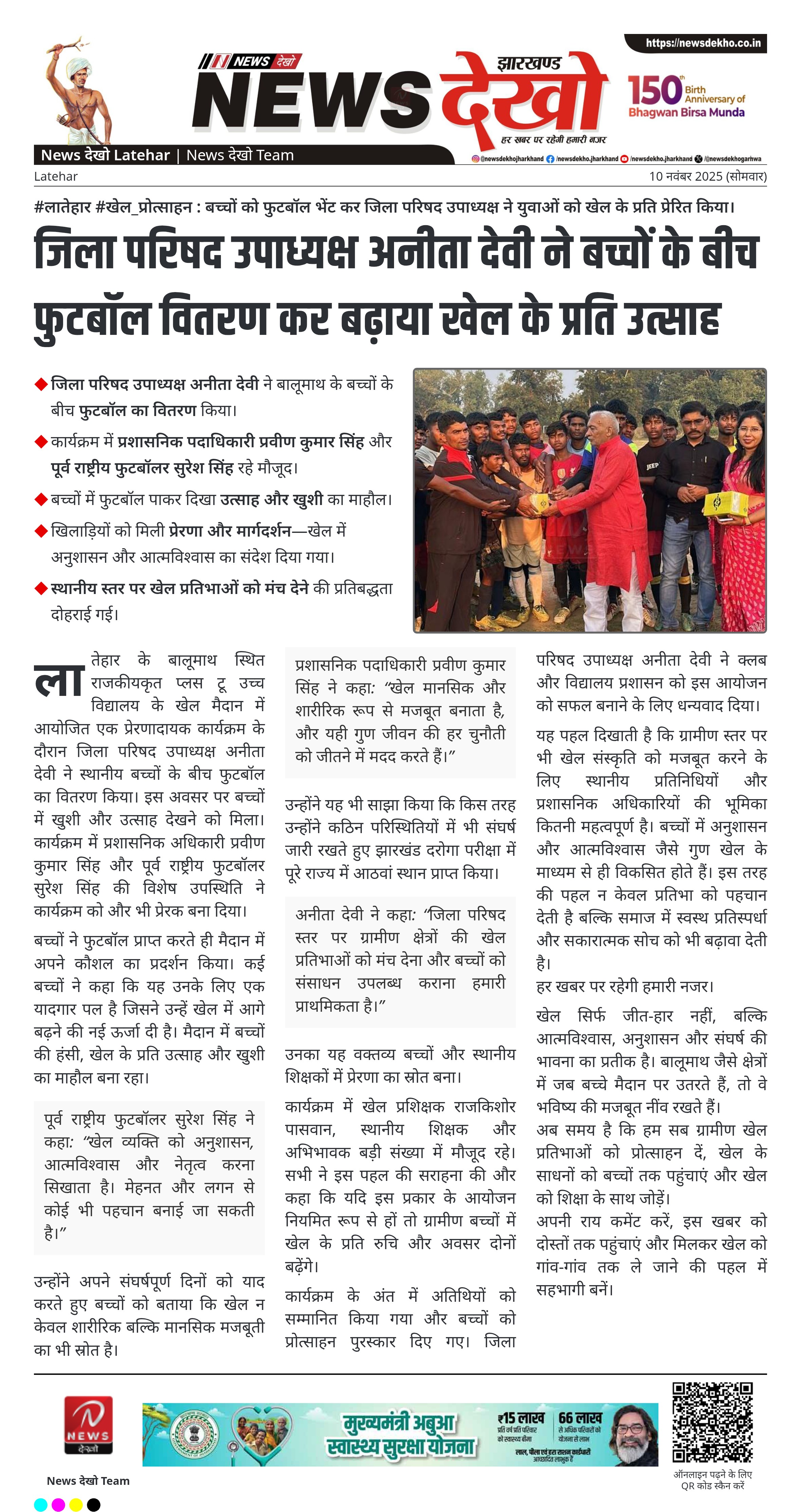 • जिला परिषद उपाध्यक्ष अनीता देवी ने बालूमाथ के बच्चों के बीच फुटबॉल का वितरण किया।