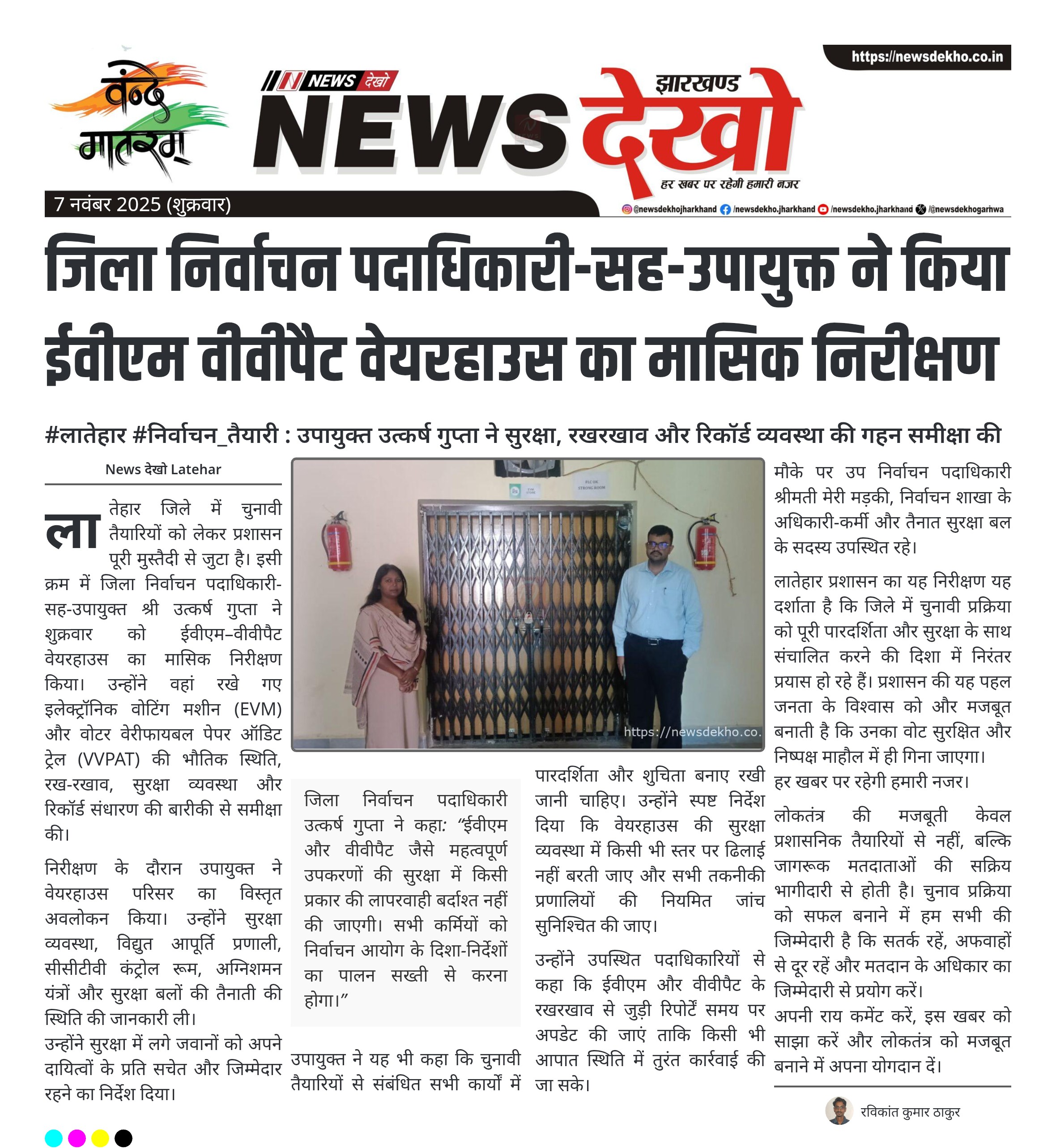 लातेहार प्रशासन का यह निरीक्षण यह दर्शाता है कि जिले में चुनावी प्रक्रिया को पूरी पारदर्शिता और सुरक्षा के साथ संचालित करने की दिशा में निरंतर प्रयास हो रहे हैं। प्रशासन की यह पहल जनता के विश्वास को और मजबूत बनाती है कि उनका वोट सुरक्षित और निष्पक्ष माहौल में ही गिना जाएगा।