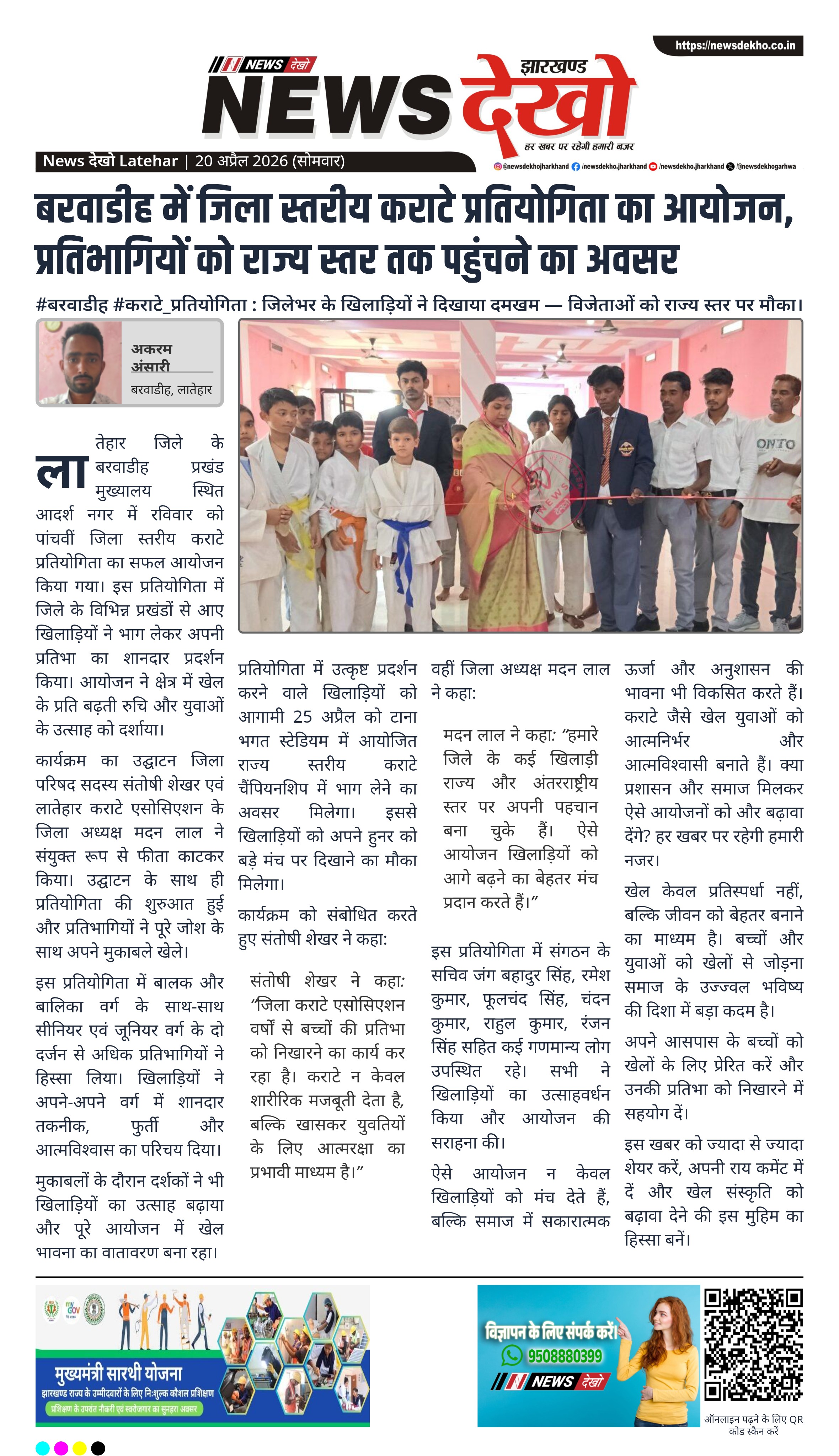 संतोषी शेखर ने कहा: “जिला कराटे एसोसिएशन वर्षों से बच्चों की प्रतिभा को निखारने का कार्य कर रहा है। कराटे न केवल शारीरिक मजबूती देता है, बल्कि खासकर युवतियों के लिए आत्मरक्षा का प्रभावी माध्यम है।”