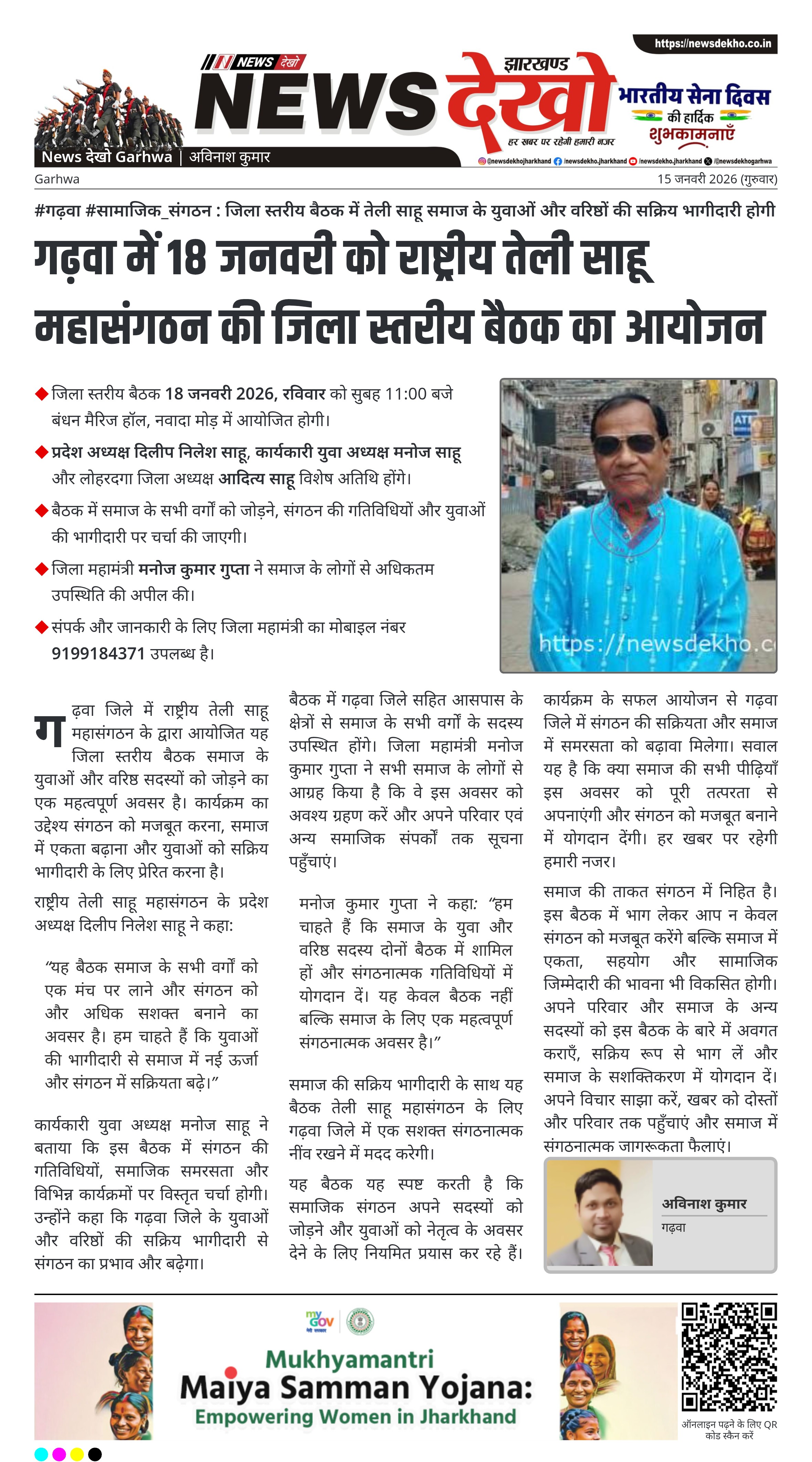 गढ़वा में 18 जनवरी 2026 को राष्ट्रीय तेली साहू महासंगठन की जिला स्तरीय बैठक बंधन मैरिज हॉल, नवादा मोड़ में आयोजित होगी। बैठक में प्रदेश अध्यक्ष दिलीप निलेश साहू, कार्यकारी युवा अध्यक्ष मनोज साहू और लोहरदगा जिला अध्यक्ष आदित्य साहू विशेष रूप से उपस्थित रहेंगे। यह कार्यक्रम समाज के सदस्यों को जोड़ने और संगठनात्मक गतिविधियों पर चर्चा करने के लिए महत्वपूर्ण माना जा रहा है।