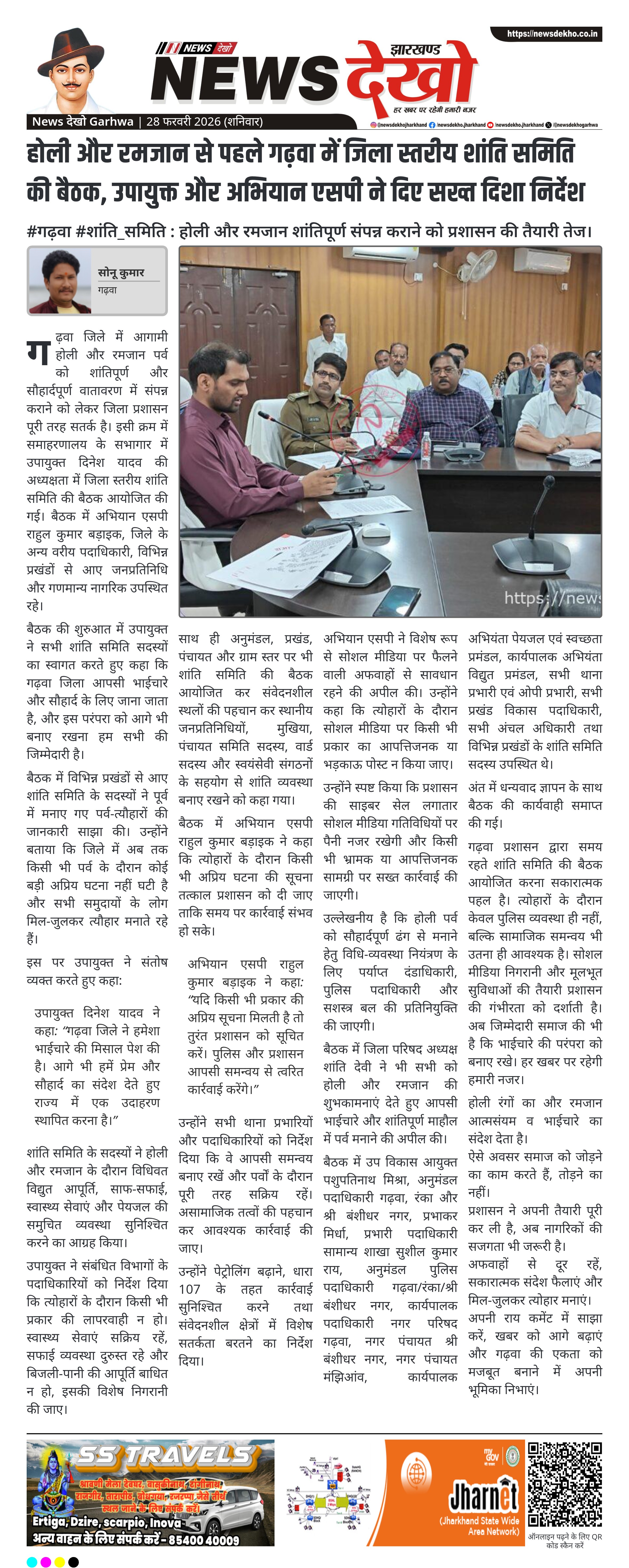 गढ़वा समाहरणालय में होली और रमजान पर्व को सौहार्दपूर्ण माहौल में संपन्न कराने हेतु जिला स्तरीय शांति समिति की बैठक आयोजित हुई। उपायुक्त दिनेश यादव की अध्यक्षता में हुई बैठक में अभियान एसपी राहुल कुमार बड़ाइक सहित वरीय अधिकारी और जनप्रतिनिधि शामिल हुए। पर्वों के दौरान विधि-व्यवस्था, विद्युत, पेयजल, स्वास्थ्य सेवाएं और सोशल मीडिया निगरानी पर विशेष निर्देश दिए गए। प्रशासन ने जिलेवासियों से शांति बनाए रखने की अपील की।