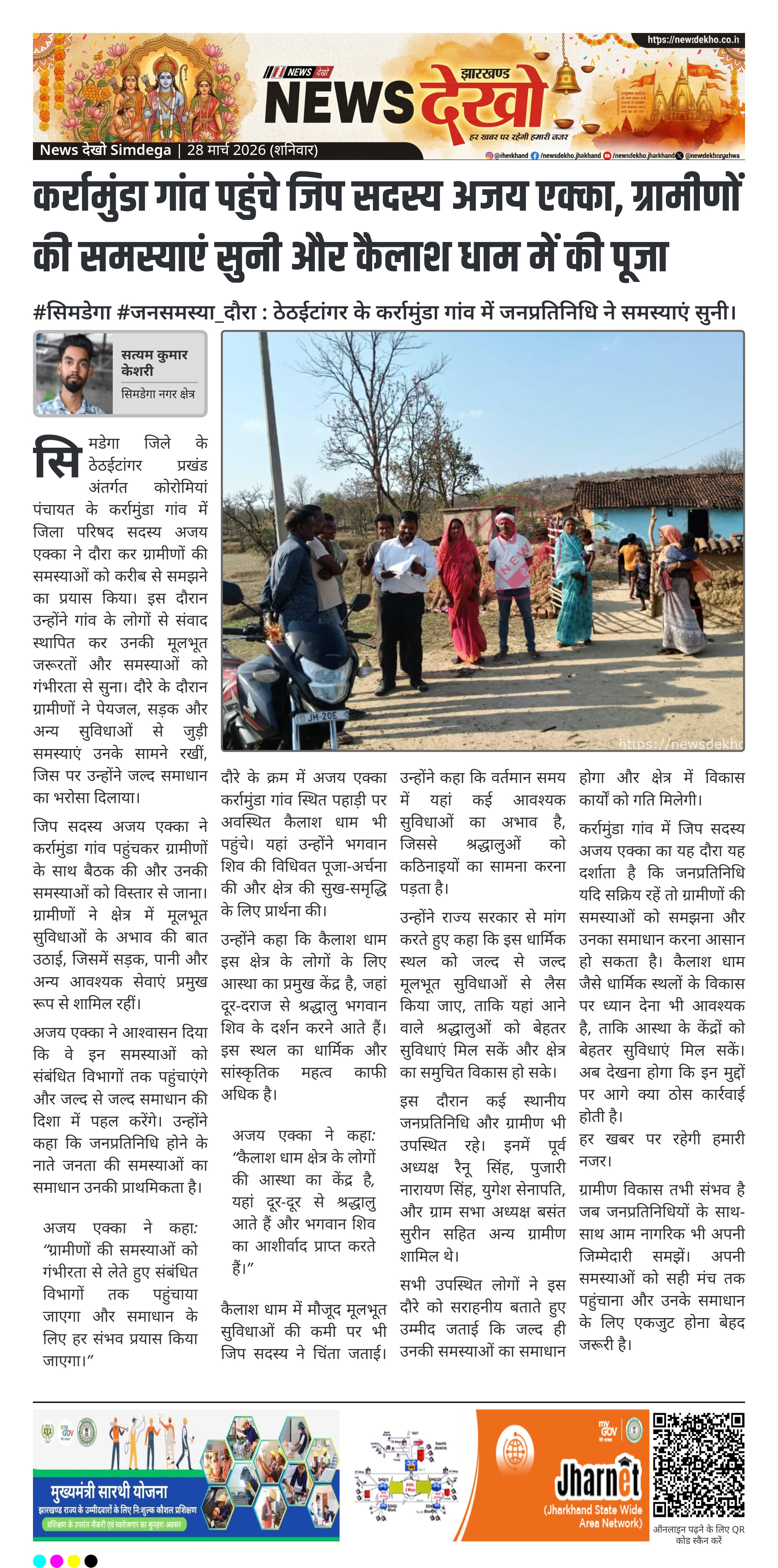 सिमडेगा जिले के ठेठईटांगर प्रखंड अंतर्गत कर्रामुंडा गांव में जिला परिषद सदस्य अजय एक्का ने दौरा किया। उन्होंने ग्रामीणों से मुलाकात कर उनकी मूलभूत समस्याओं को सुना और समाधान का आश्वासन दिया। दौरे के दौरान वे कैलाश धाम भी पहुंचे, जहां भगवान शिव की पूजा-अर्चना की। यह दौरा क्षेत्रीय विकास और जनसमस्याओं के समाधान की दिशा में महत्वपूर्ण माना जा रहा है।