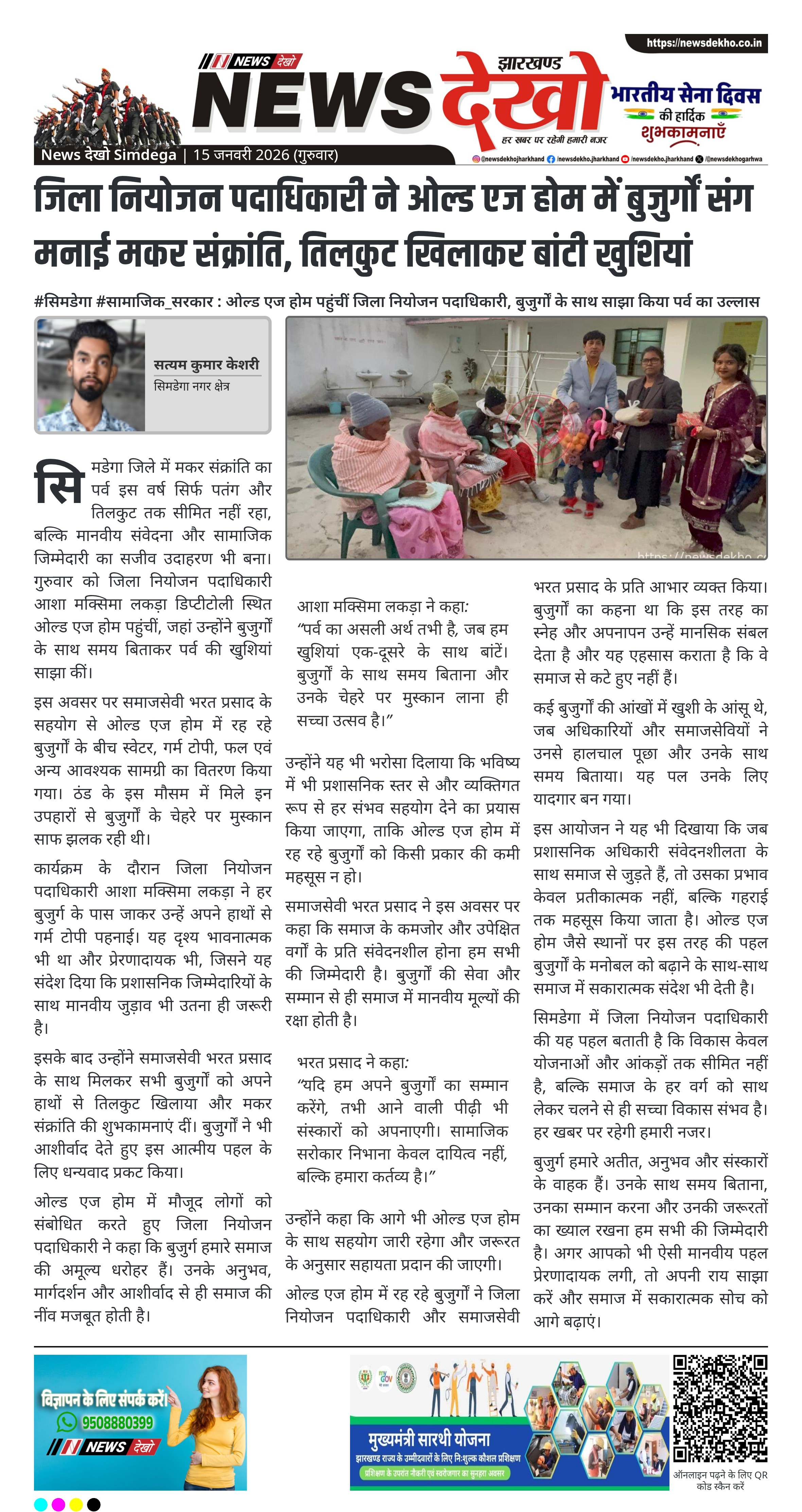 सिमडेगा जिले में मकर संक्रांति का पर्व इस वर्ष सिर्फ पतंग और तिलकुट तक सीमित नहीं रहा, बल्कि मानवीय संवेदना और सामाजिक जिम्मेदारी का सजीव उदाहरण भी बना। गुरुवार को जिला नियोजन पदाधिकारी आशा मक्सिमा लकड़ा डिप्टीटोली स्थित ओल्ड एज होम पहुंचीं, जहां उन्होंने बुजुर्गों के साथ समय बिताकर पर्व की खुशियां साझा कीं।