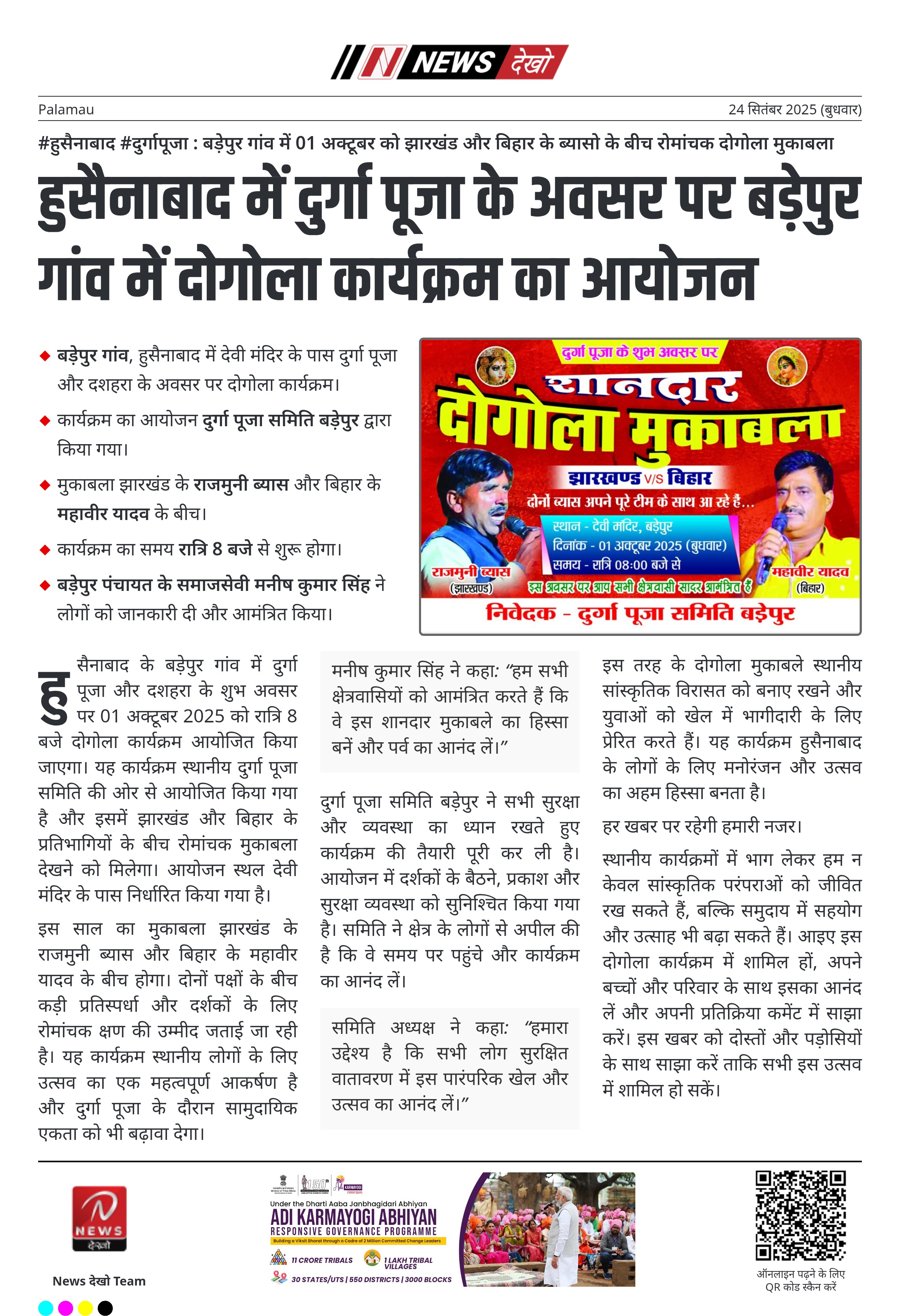 हुसैनाबाद के बड़ेपुर गांव में दुर्गा पूजा और दशहरा के शुभ अवसर पर 01 अक्टूबर 2025 को रात्रि 8 बजे दोगोला कार्यक्रम आयोजित किया जाएगा। यह कार्यक्रम स्थानीय दुर्गा पूजा समिति की ओर से आयोजित किया गया है और इसमें झारखंड और बिहार के प्रतिभागियों के बीच रोमांचक मुकाबला देखने को मिलेगा। आयोजन स्थल देवी मंदिर के पास निर्धारित किया गया है।