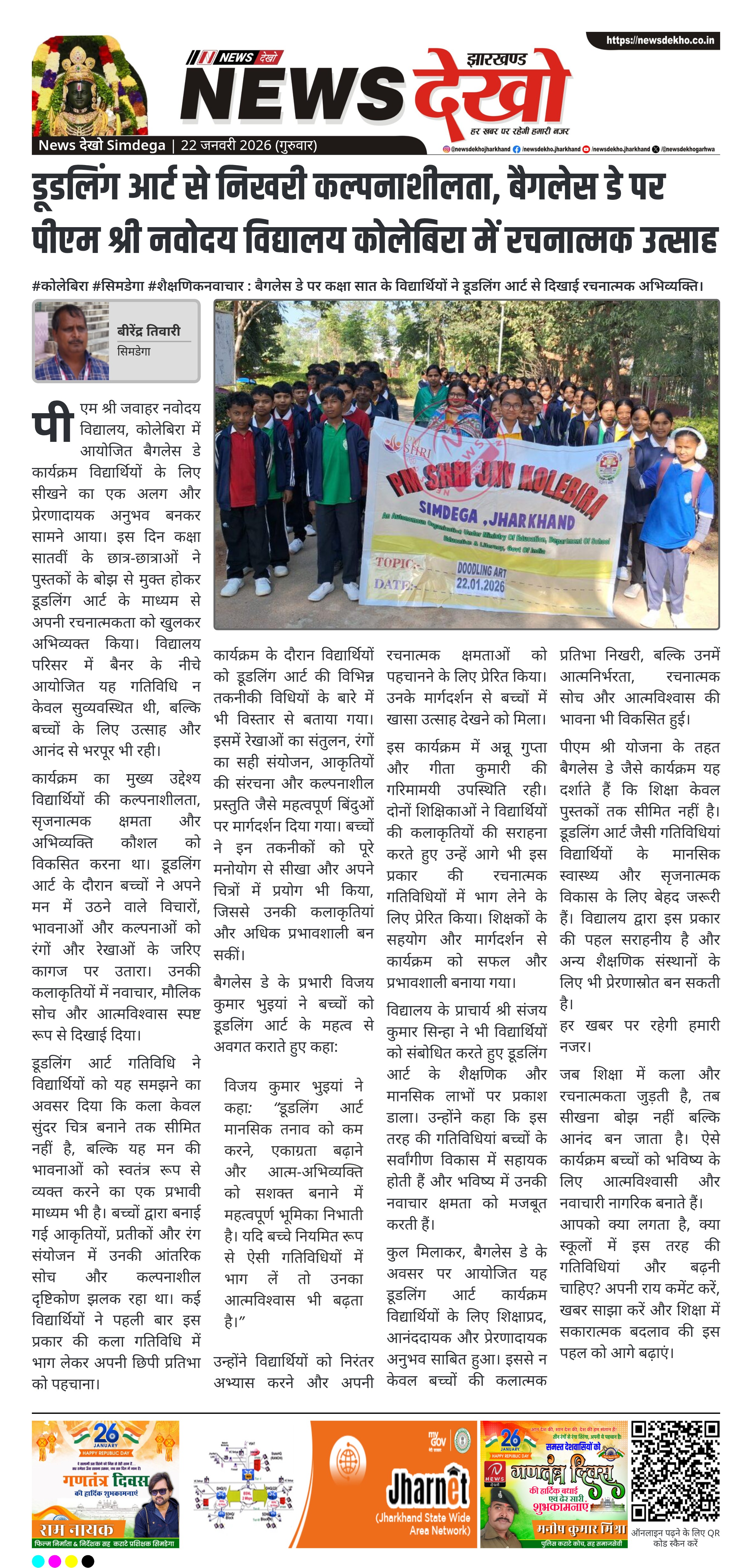 सिमडेगा जिले के पीएम श्री जवाहर नवोदय विद्यालय, कोलेबिरा में पीएम श्री योजना के तहत बैगलेस डे कार्यक्रम आयोजित किया गया। इस अवसर पर कक्षा सातवीं के छात्र-छात्राओं ने डूडलिंग आर्ट गतिविधि में उत्साहपूर्वक भाग लिया। कार्यक्रम का उद्देश्य विद्यार्थियों को पुस्तक-केन्द्रित पढ़ाई से हटकर रचनात्मक सोच और कल्पनाशीलता विकसित करने का अवसर देना था। कला आधारित इस गतिविधि ने बच्चों में आत्म-अभिव्यक्ति, नवाचार और आत्मविश्वास को मजबूत किया।