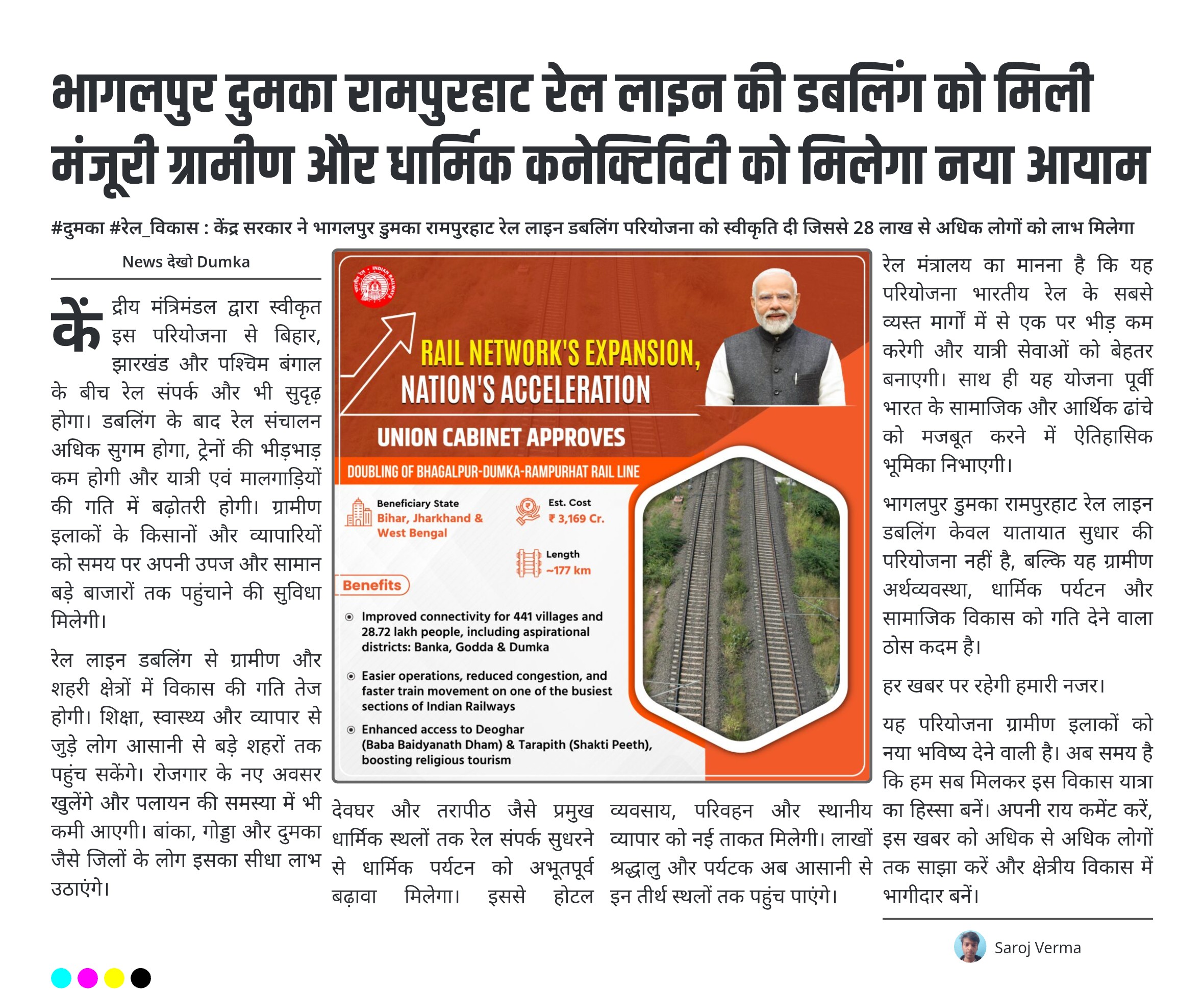 #दुमका #रेल_विकास : केंद्र सरकार ने भागलपुर डुमका रामपुरहाट रेल लाइन डबलिंग परियोजना को स्वीकृति दी जिससे 28 लाख से अधिक लोगों को लाभ मिलेगा