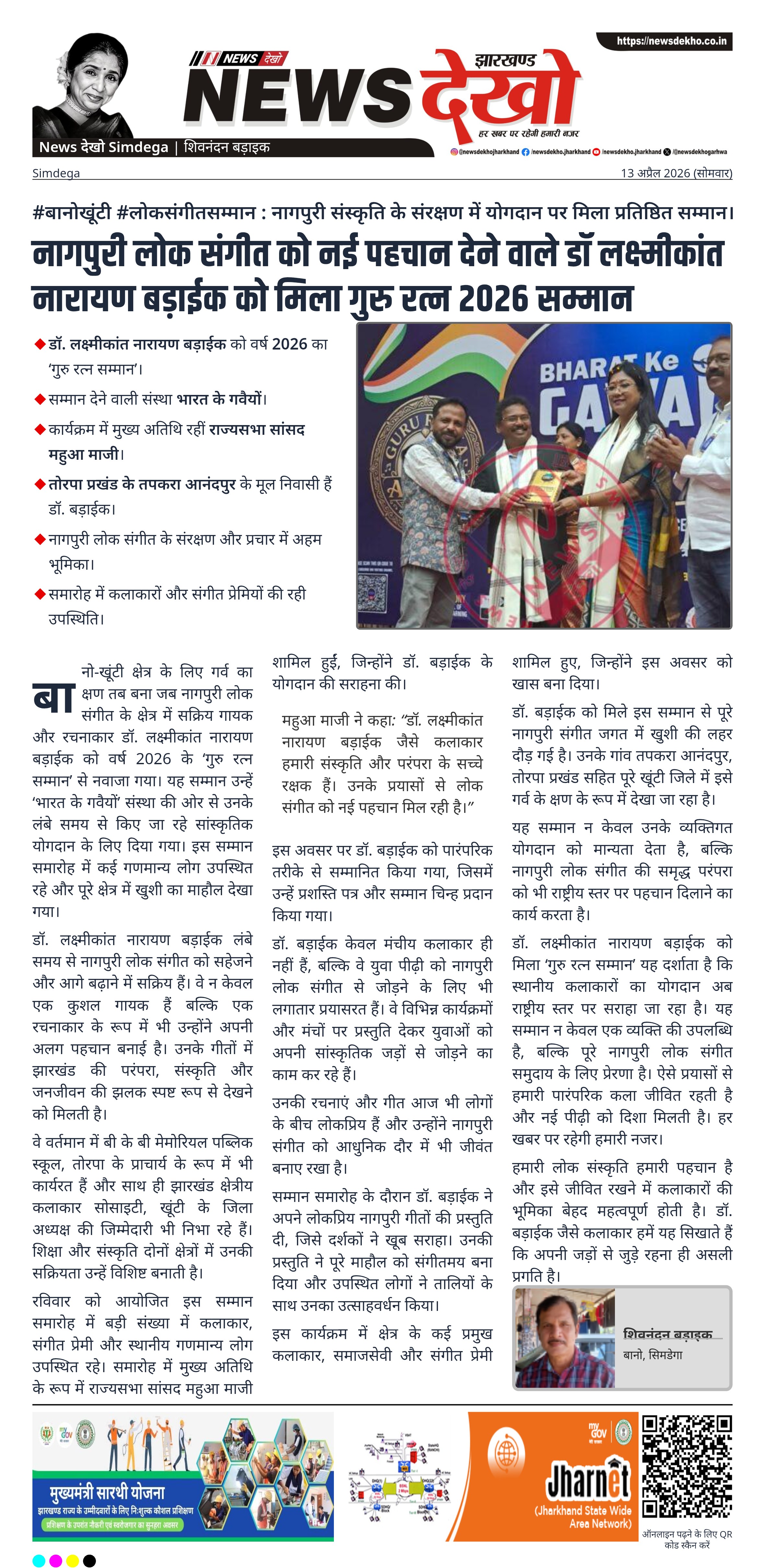 बानो-खूंटी क्षेत्र के लिए गर्व का क्षण तब बना जब नागपुरी लोक संगीत के क्षेत्र में सक्रिय गायक और रचनाकार डॉ. लक्ष्मीकांत नारायण बड़ाईक को वर्ष 2026 के ‘गुरु रत्न सम्मान’ से नवाजा गया। यह सम्मान उन्हें ‘भारत के गवैयों’ संस्था की ओर से उनके लंबे समय से किए जा रहे सांस्कृतिक योगदान के लिए दिया गया। इस सम्मान समारोह में कई गणमान्य लोग उपस्थित रहे और पूरे क्षेत्र में खुशी का माहौल देखा गया।