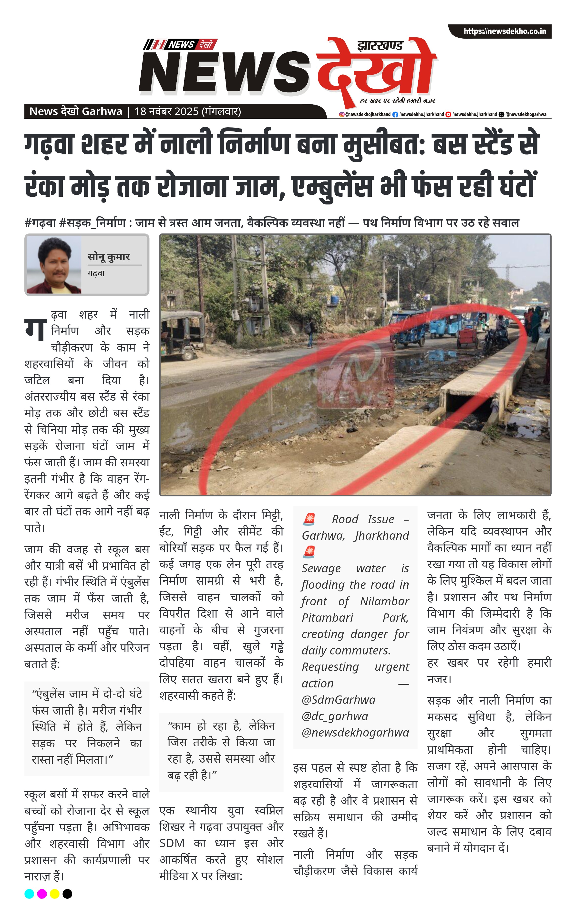 गढ़वा शहर में नाली निर्माण और सड़क चौड़ीकरण के काम ने शहरवासियों के जीवन को जटिल बना दिया है। अंतरराज्यीय बस स्टैंड से रंका मोड़ तक और छोटी बस स्टैंड से चिनिया मोड़ तक की मुख्य सड़कें रोजाना घंटों जाम में फंस जाती हैं। जाम की समस्या इतनी गंभीर है कि वाहन रेंग-रेंगकर आगे बढ़ते हैं और कई बार तो घंटों तक आगे नहीं बढ़ पाते।
