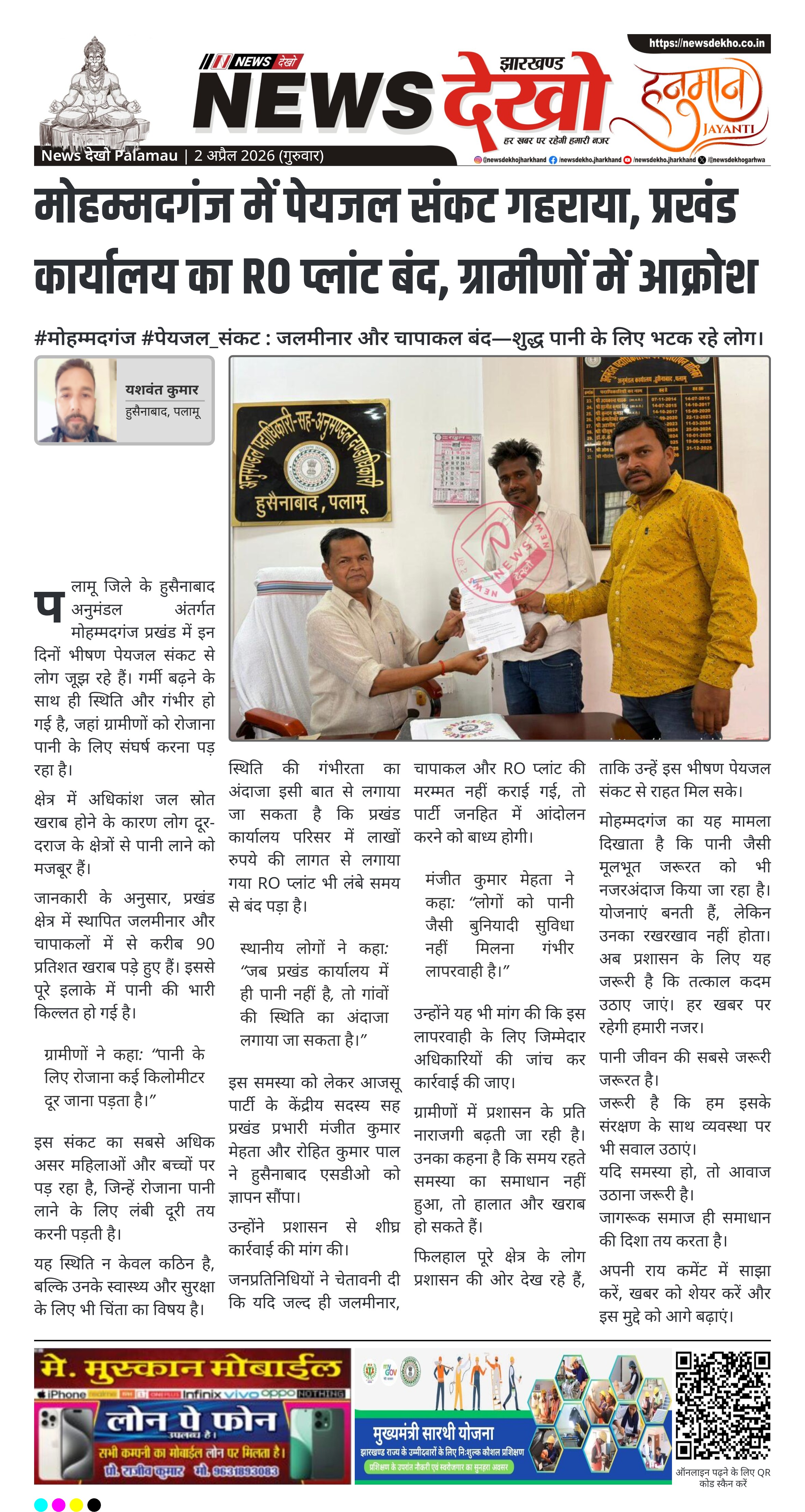 पलामू के मोहम्मदगंज प्रखंड में पेयजल संकट गंभीर रूप ले चुका है, जहां अधिकांश जलमीनार और चापाकल खराब पड़े हैं। प्रखंड कार्यालय का RO प्लांट भी लंबे समय से बंद है, जिससे लोगों को शुद्ध पानी नहीं मिल पा रहा। इस समस्या को लेकर जनप्रतिनिधियों ने एसडीओ को ज्ञापन सौंपा है। प्रशासन से त्वरित समाधान की मांग तेज हो गई है।