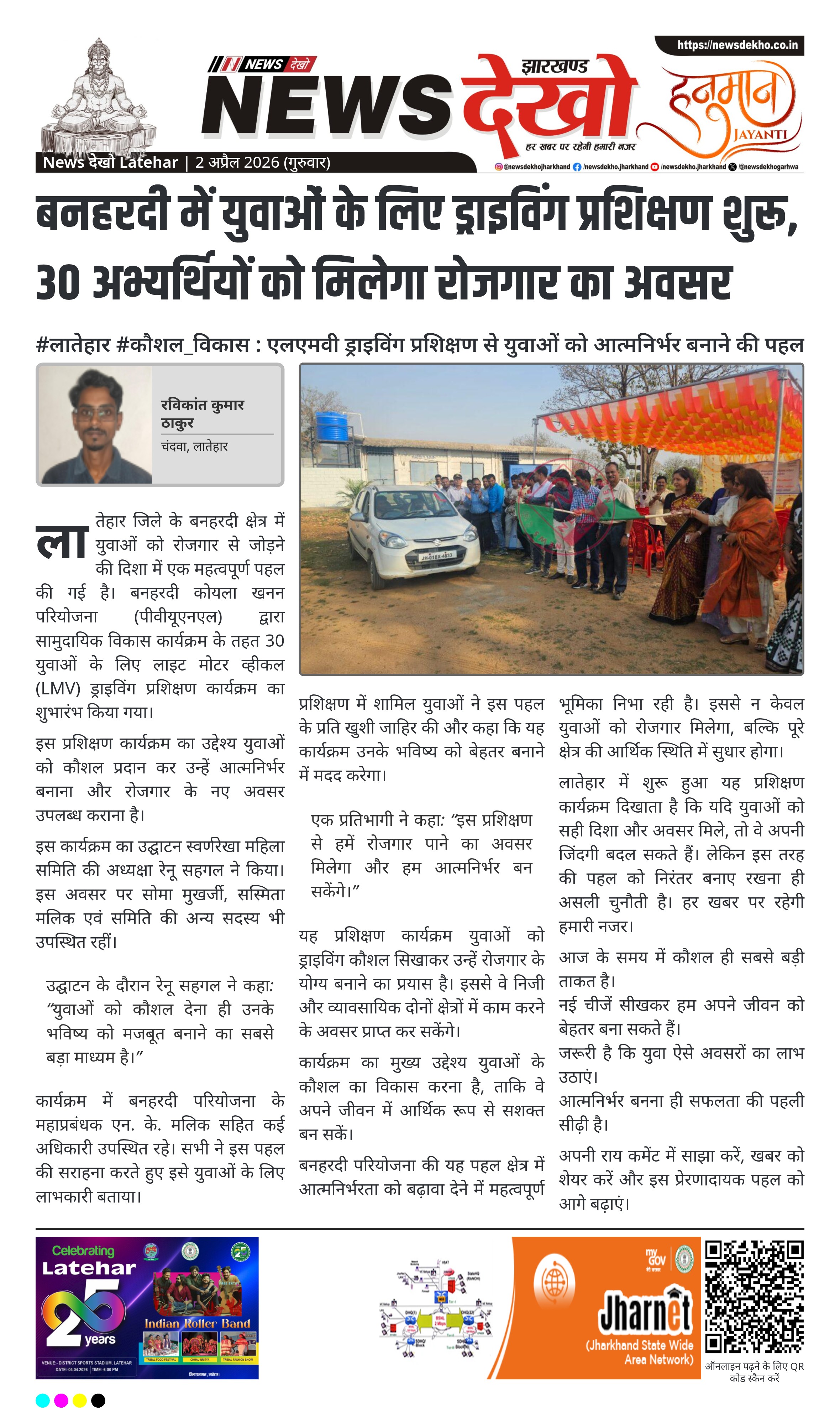 लातेहार जिले के बनहरदी क्षेत्र में युवाओं को रोजगार से जोड़ने की दिशा में एक महत्वपूर्ण पहल की गई है। बनहरदी कोयला खनन परियोजना (पीवीयूएनएल) द्वारा सामुदायिक विकास कार्यक्रम के तहत 30 युवाओं के लिए लाइट मोटर व्हीकल (LMV) ड्राइविंग प्रशिक्षण कार्यक्रम का शुभारंभ किया गया।