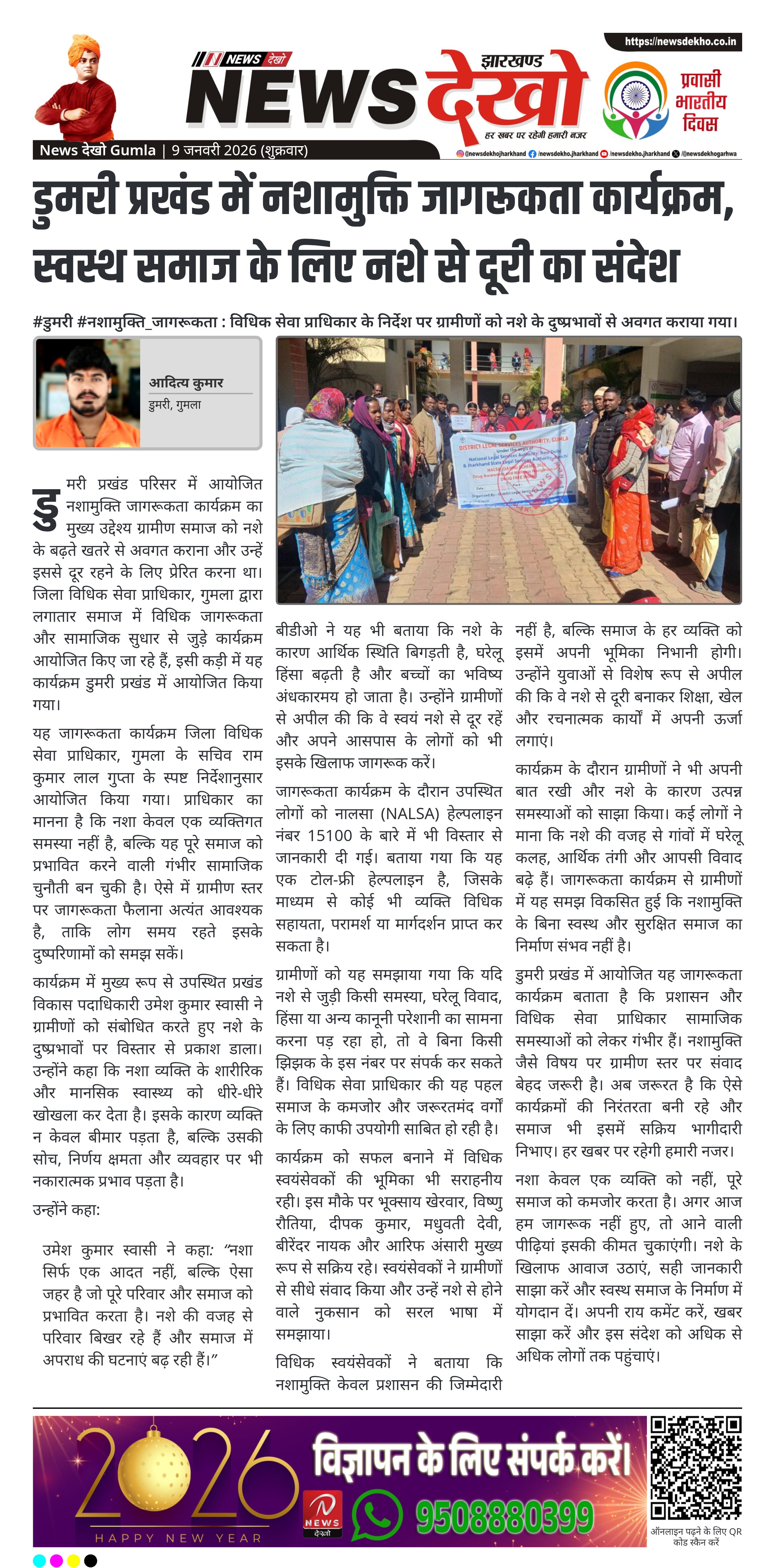 गुमला जिले के डुमरी प्रखंड परिसर में शुक्रवार को नशामुक्ति को लेकर जागरूकता कार्यक्रम आयोजित किया गया। यह कार्यक्रम जिला विधिक सेवा प्राधिकार, गुमला के सचिव राम कुमार लाल गुप्ता के निर्देशानुसार संपन्न हुआ। कार्यक्रम में प्रशासनिक पदाधिकारियों और विधिक स्वयंसेवकों ने नशे के सामाजिक, पारिवारिक और कानूनी दुष्परिणामों पर विस्तार से जानकारी दी। इसका उद्देश्य ग्रामीणों को नशे से दूर रहने और स्वस्थ समाज के निर्माण के लिए प्रेरित करना था।