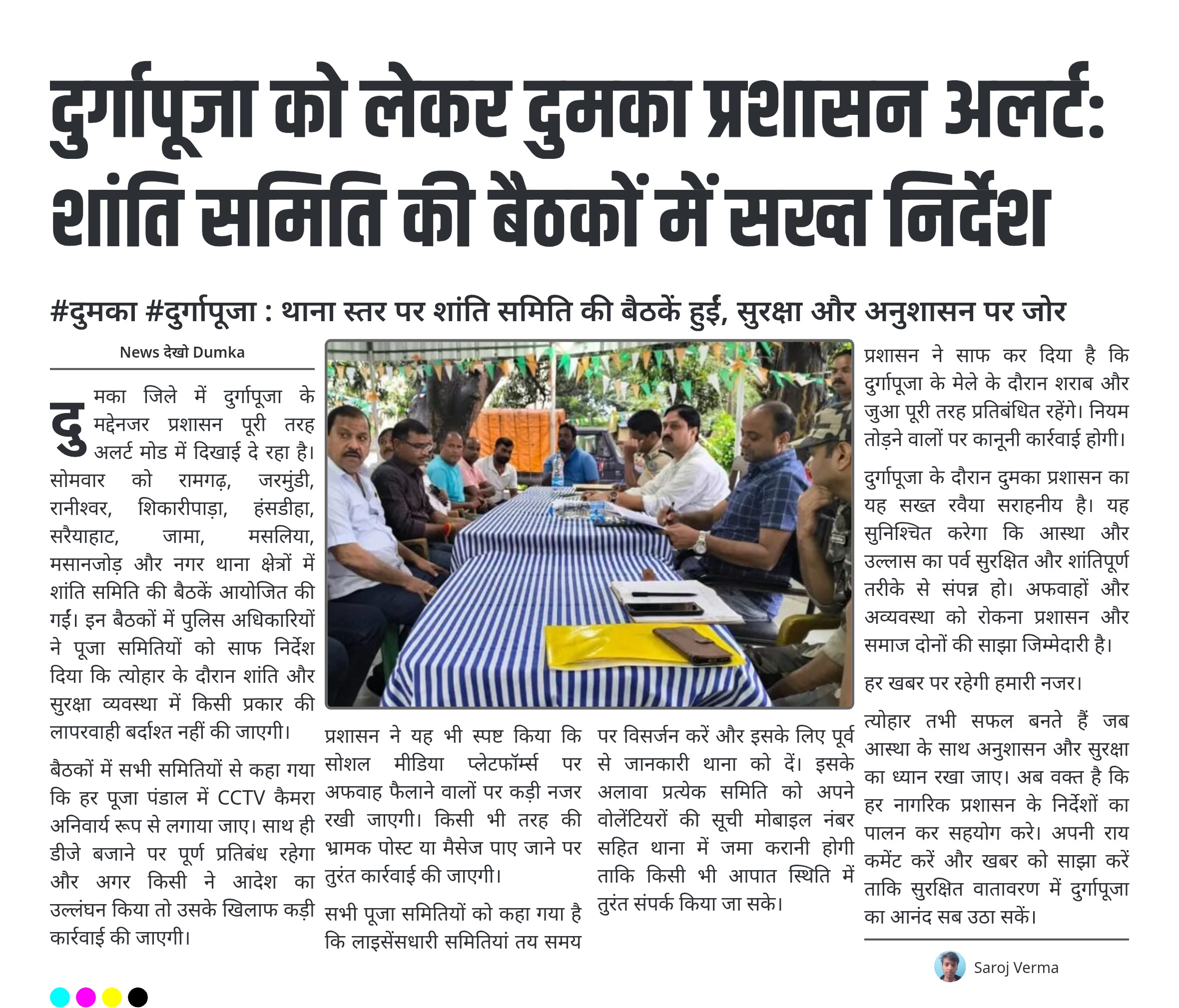 दुर्गापूजा के दौरान दुमका प्रशासन का यह सख्त रवैया सराहनीय है। यह सुनिश्चित करेगा कि आस्था और उल्लास का पर्व सुरक्षित और शांतिपूर्ण तरीके से संपन्न हो। अफवाहों और अव्यवस्था को रोकना प्रशासन और समाज दोनों की साझा जिम्मेदारी है।