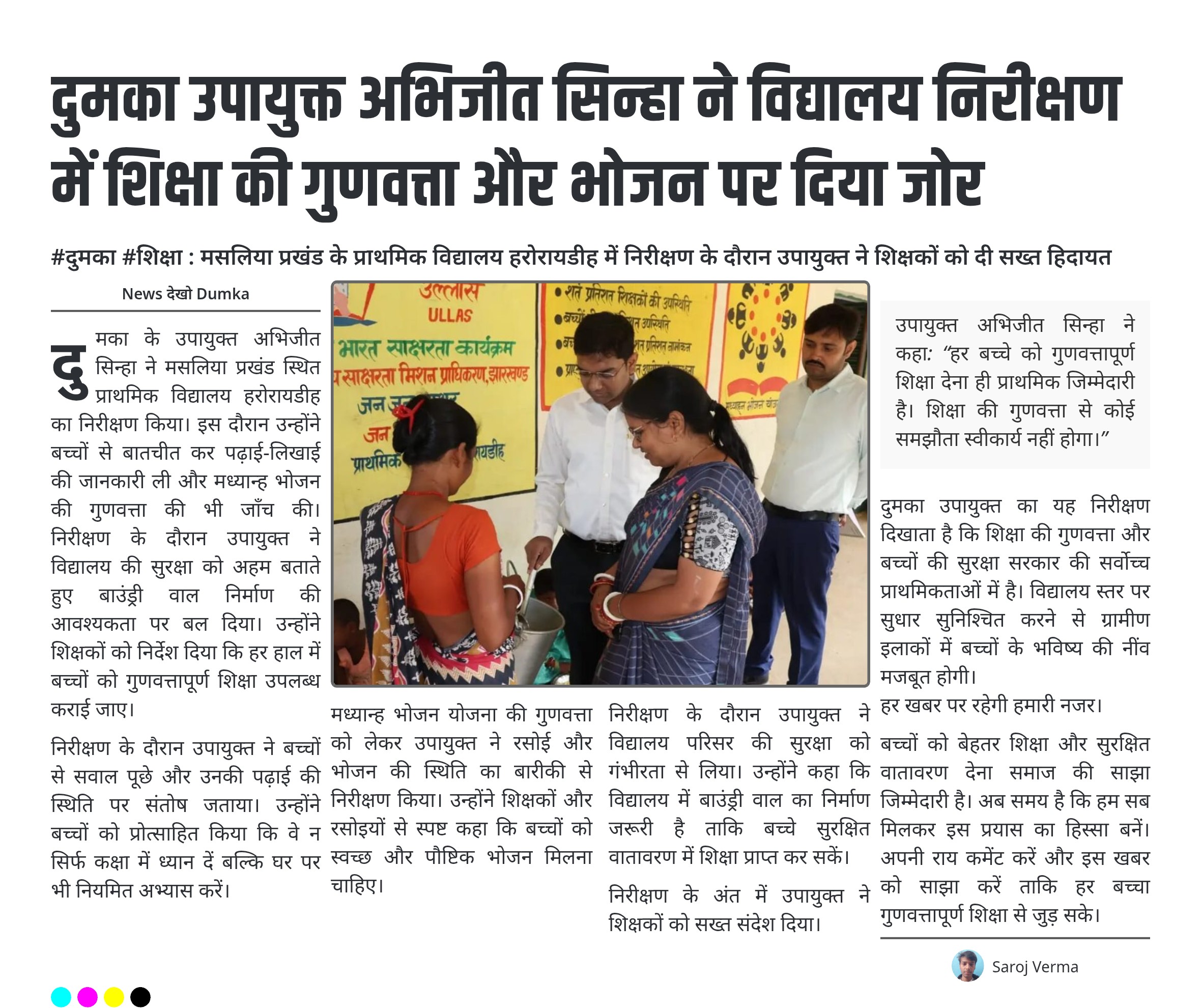 दुमका के उपायुक्त अभिजीत सिन्हा ने मसलिया प्रखंड स्थित प्राथमिक विद्यालय हरोरायडीह का निरीक्षण किया। इस दौरान उन्होंने बच्चों से बातचीत कर पढ़ाई-लिखाई की जानकारी ली और मध्यान्ह भोजन की गुणवत्ता की भी जाँच की। निरीक्षण के दौरान उपायुक्त ने विद्यालय की सुरक्षा को अहम बताते हुए बाउंड्री वाल निर्माण की आवश्यकता पर बल दिया। उन्होंने शिक्षकों को निर्देश दिया कि हर हाल में बच्चों को गुणवत्तापूर्ण शिक्षा उपलब्ध कराई जाए।