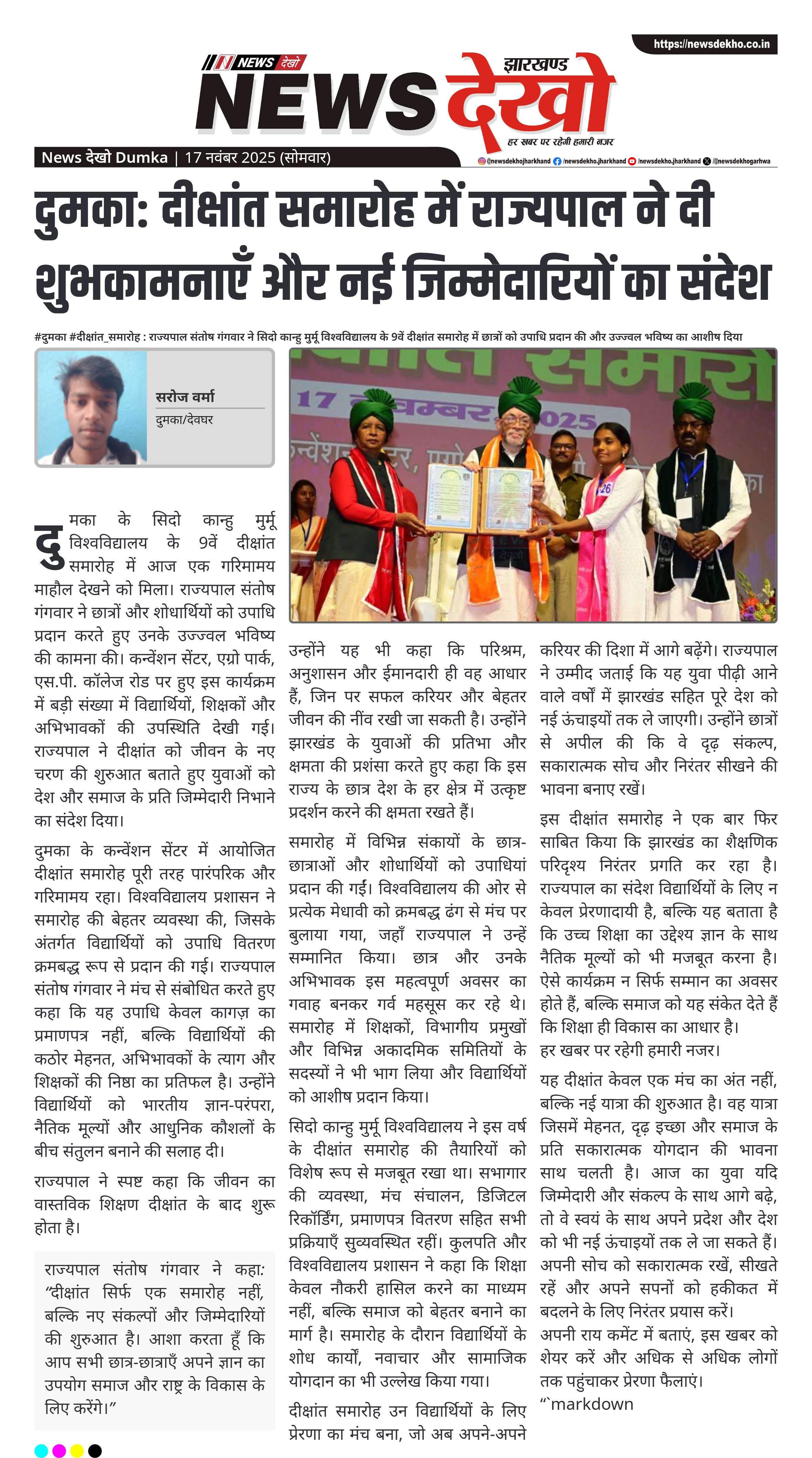 दुमका: दीक्षांत समारोह में राज्यपाल ने दी शुभकामनाएँ और नई जिम्मेदारियों का संदेश
